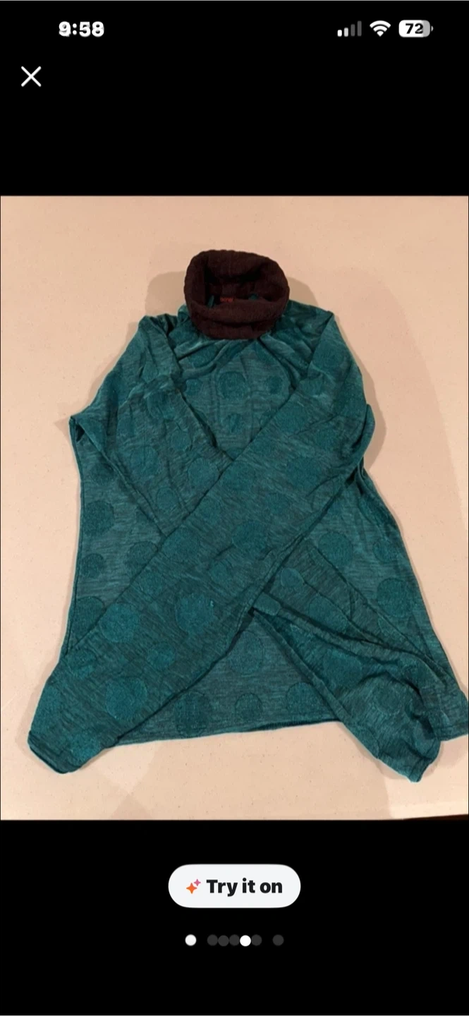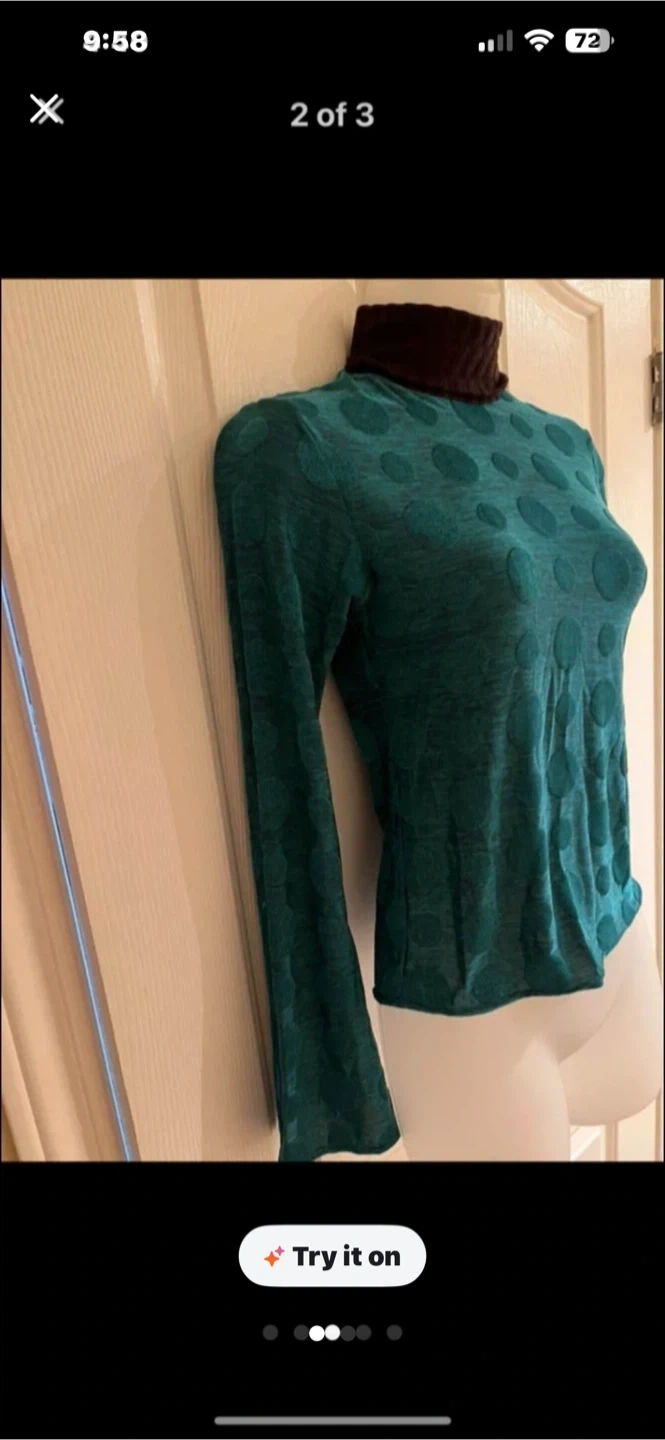A teal long-sleeve turtleneck shirt with a subtle polka dot pattern. The collar is a contrasting dark brown. It's a lightweight top perfect for layering.