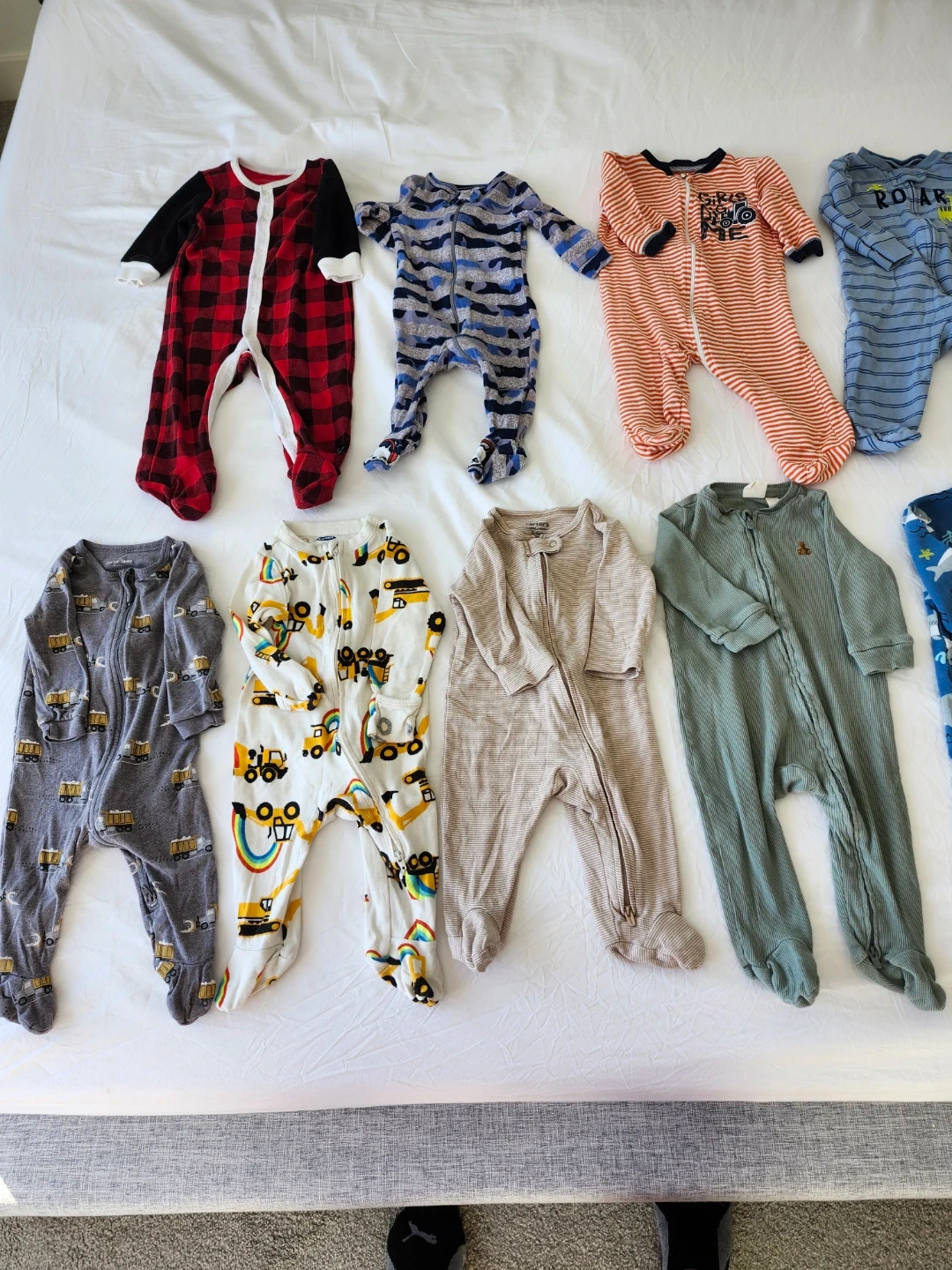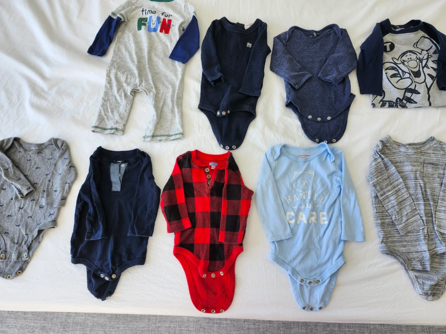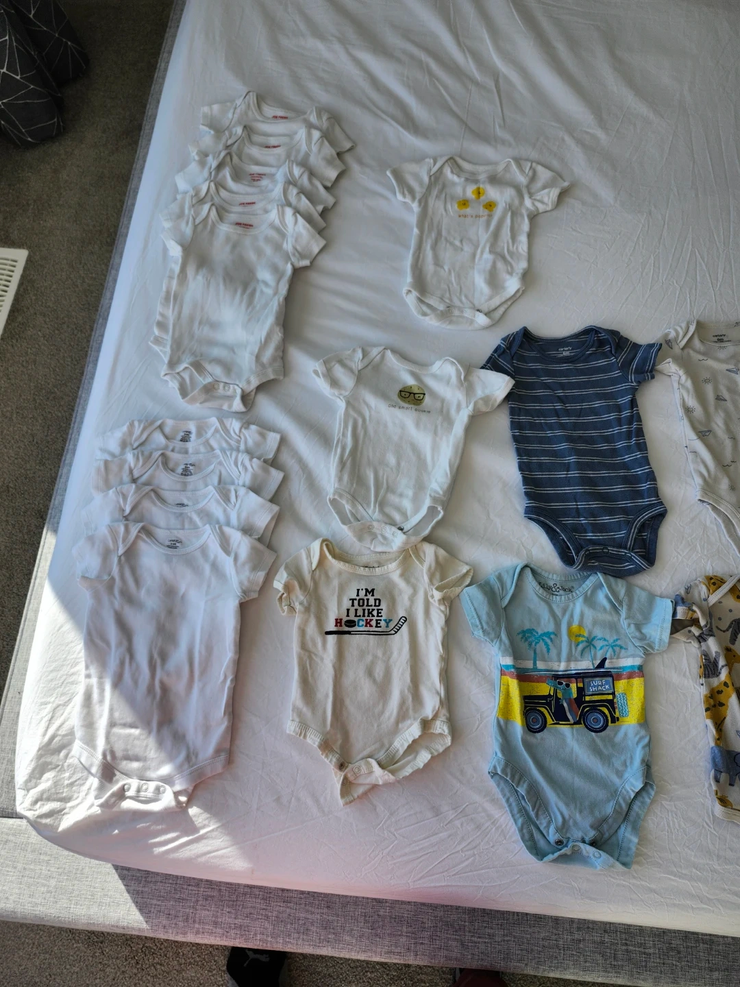 This is a bundle of baby onesies and sleepers in various sizes and designs. They're made from soft cotton materials for comfort. This bundle is perfect for a growing baby's wardrobe.