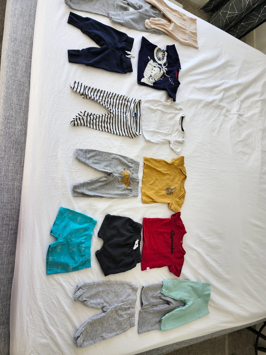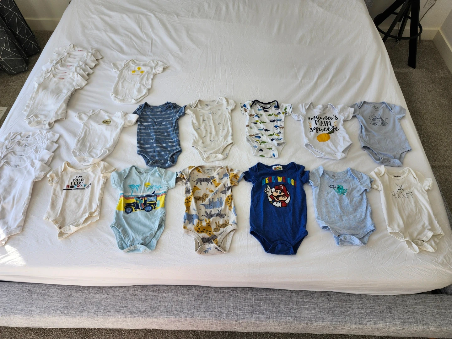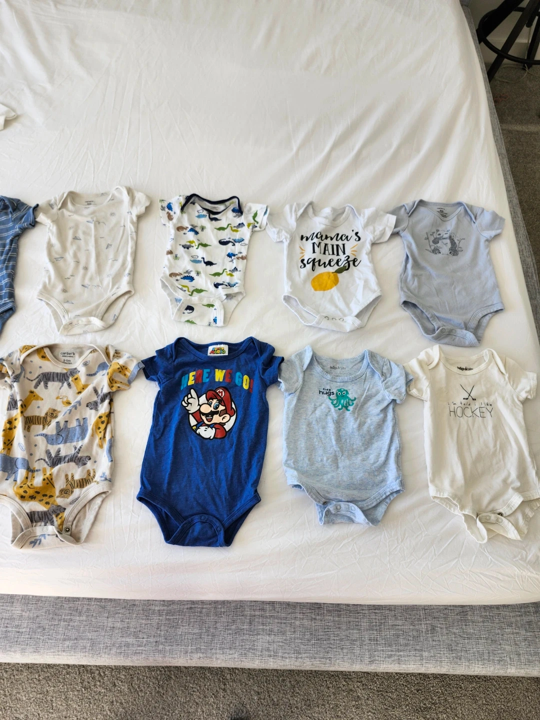 This is a bundle of baby onesies and sleepers in various sizes and designs. They're made from soft cotton materials for comfort. This bundle is perfect for a growing baby's wardrobe.