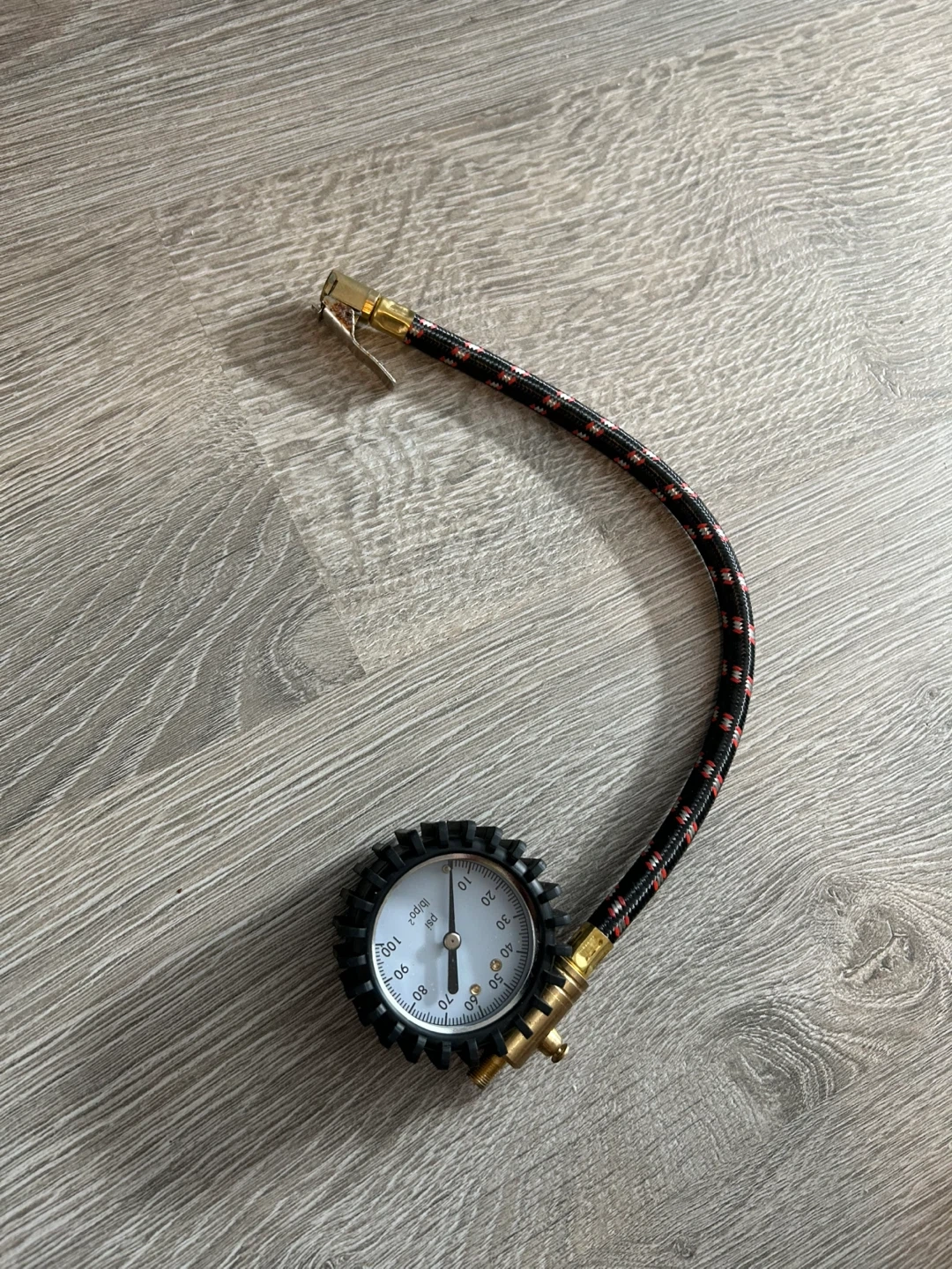 Check your tire pressure with this handy gauge. It features a flexible hose for easy access to tire valves. Measures pressure up to 100 PSI.