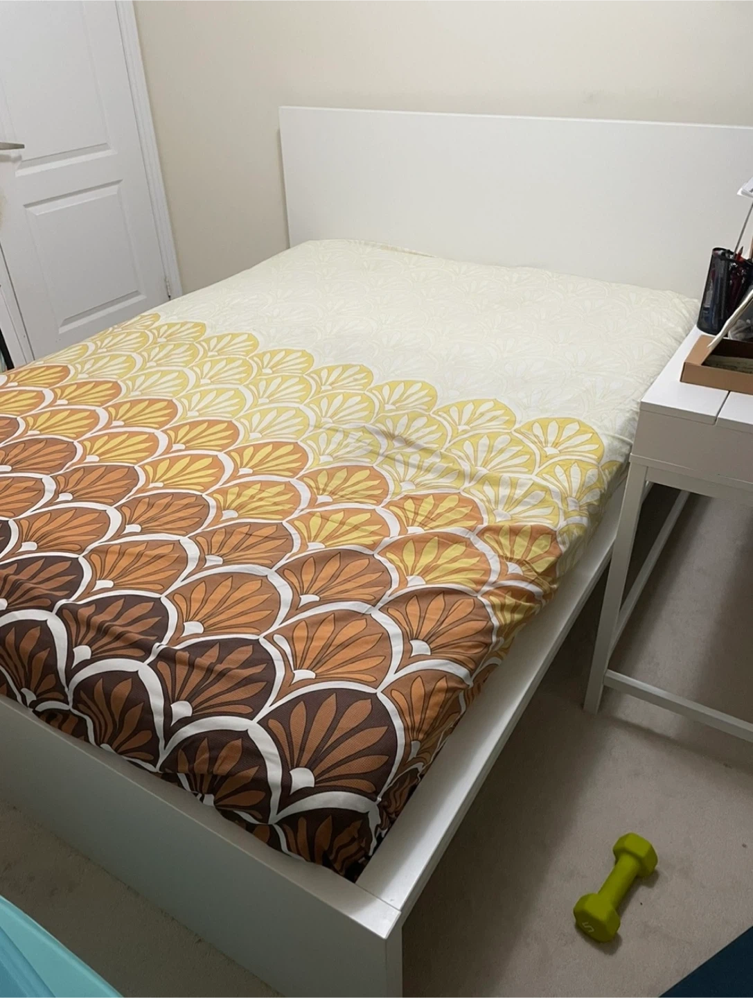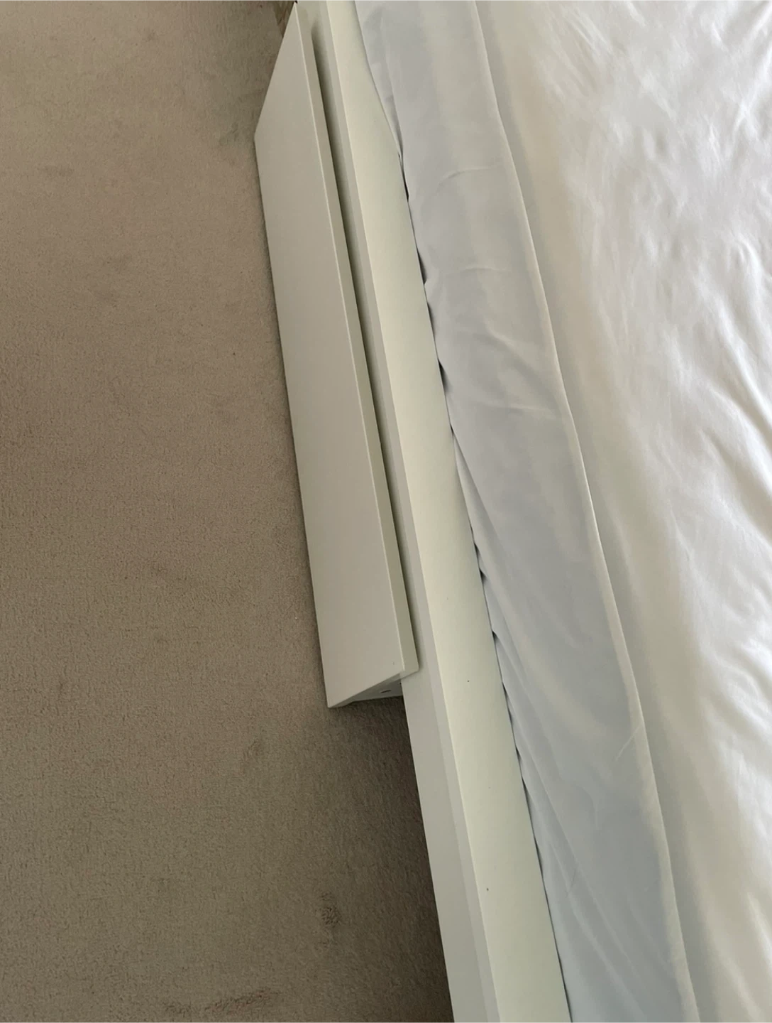 Modern white platform bed frame, clean lines. White finish. Great for adding a fresh look to your bedroom. Mattress not included.
