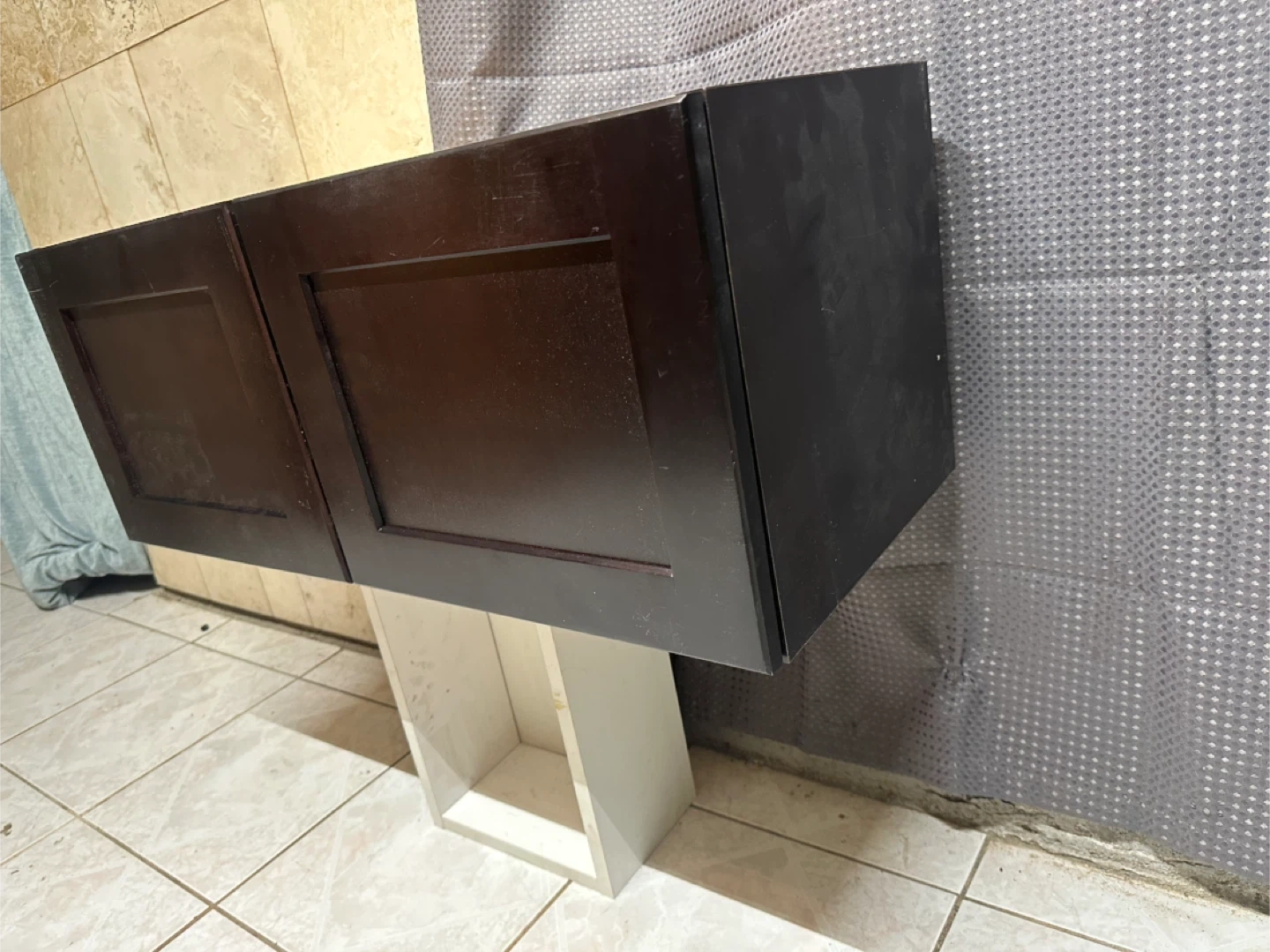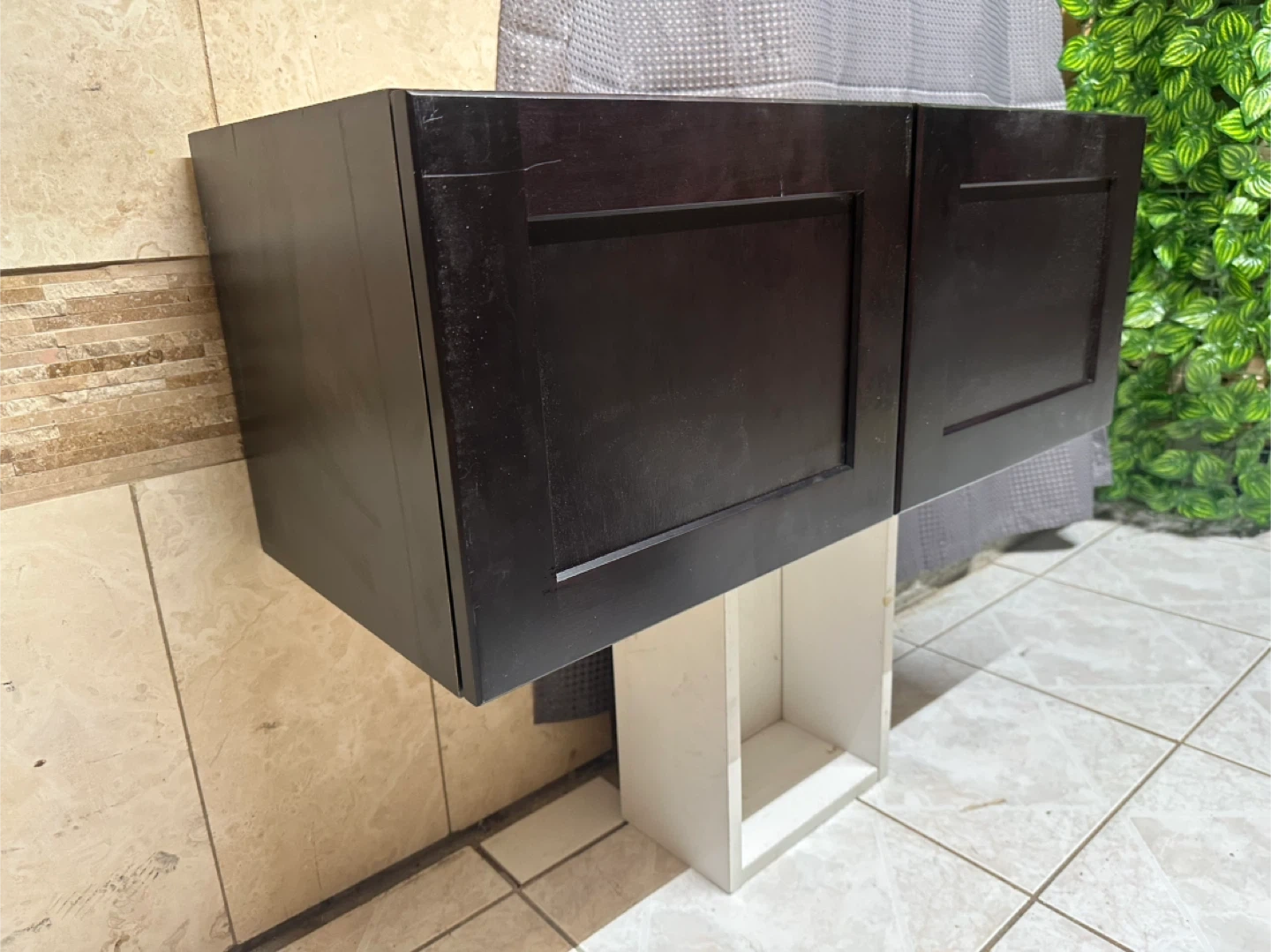 Features two dark wood doors with a clean, modern design and a light wood interior. Doors open smoothly on quality hinges. Perfect for bathrooms, laundry rooms, kitchens, or workshops.