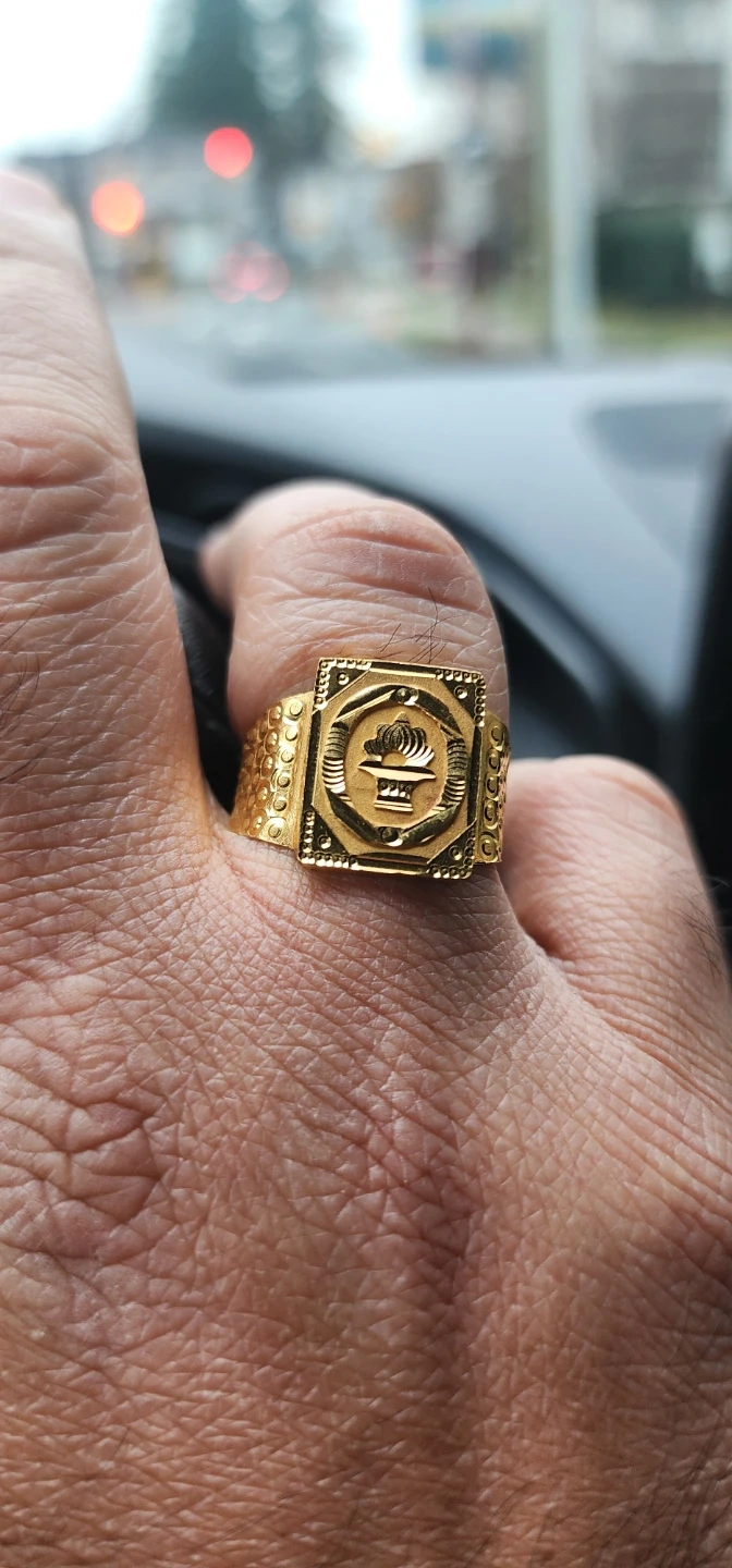 This is a men's signet ring with a gold-tone finish. The centre of the ring features an embossed design with what appears to be a crown or emblem. The band has a textured, beaded pattern on the sides. Broken