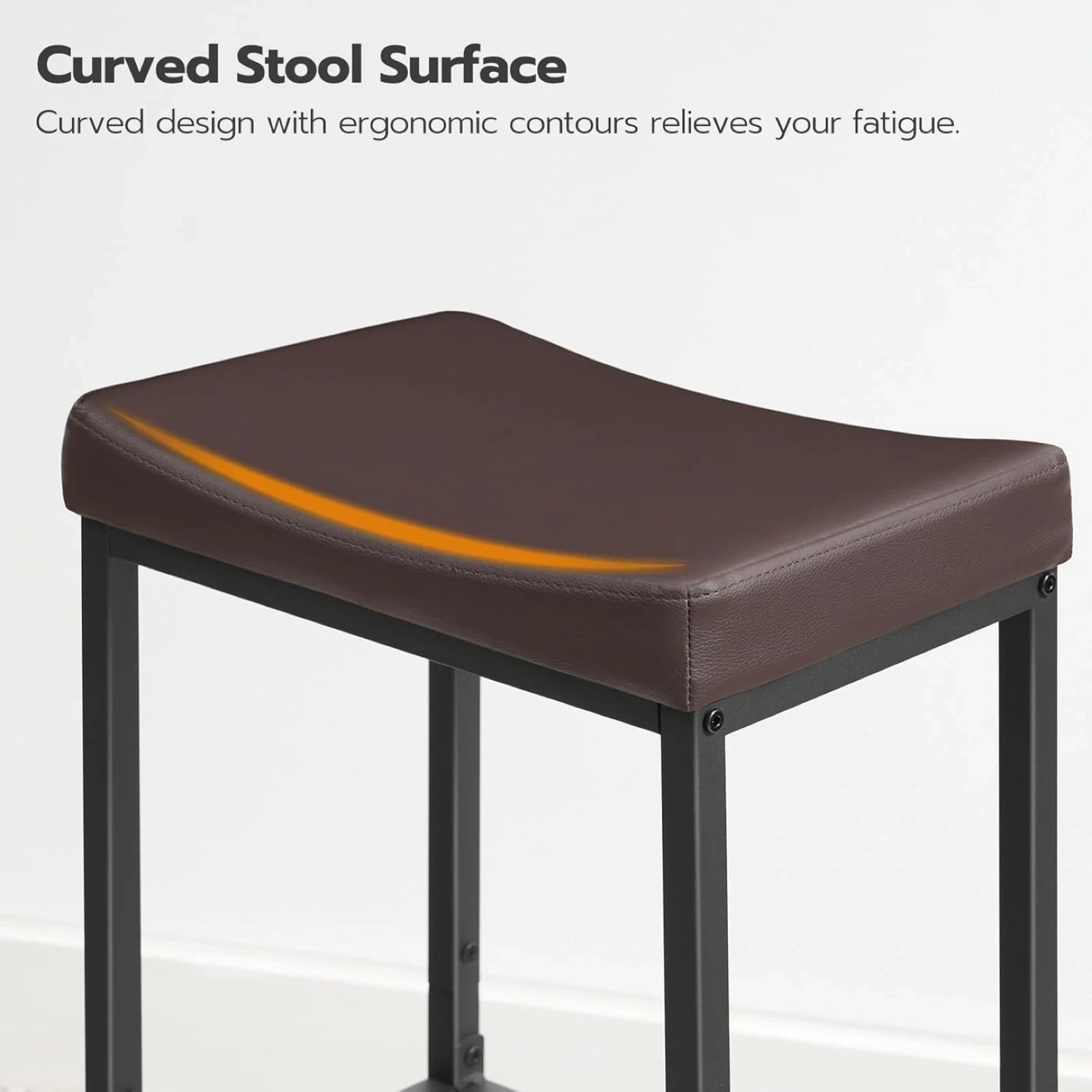 A set of two bar stools with brown faux leather saddle seats and black metal frames. The stool seats are 40cm/15.7" wide and 28cm/11" deep with a curved design. The overall height is 64cm/25.2", with a seat height of 35cm/15.8" and a footrest height of 18cm/7". These stools would fit well in a home bar or kitchen area.