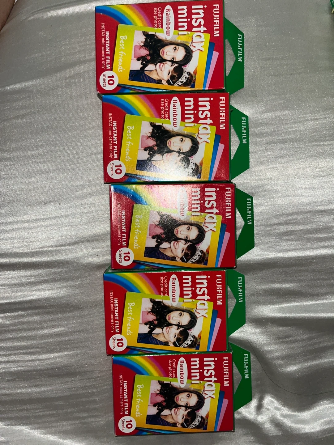 Five boxes of Fujifilm Instax Mini instant film. Each box contains 10 sheets for a total of 50 sheets. Credit card size photos.