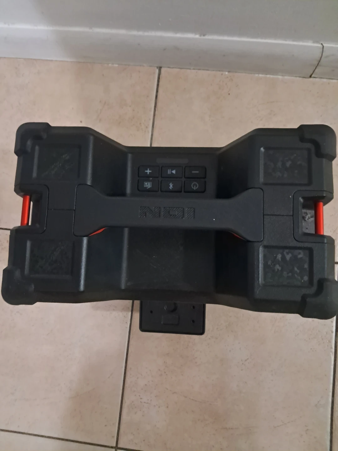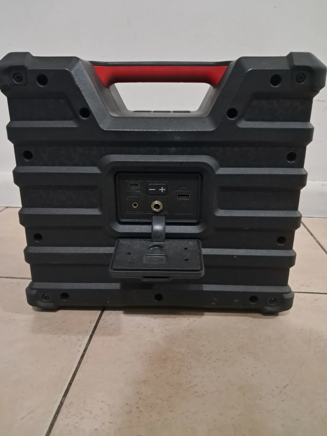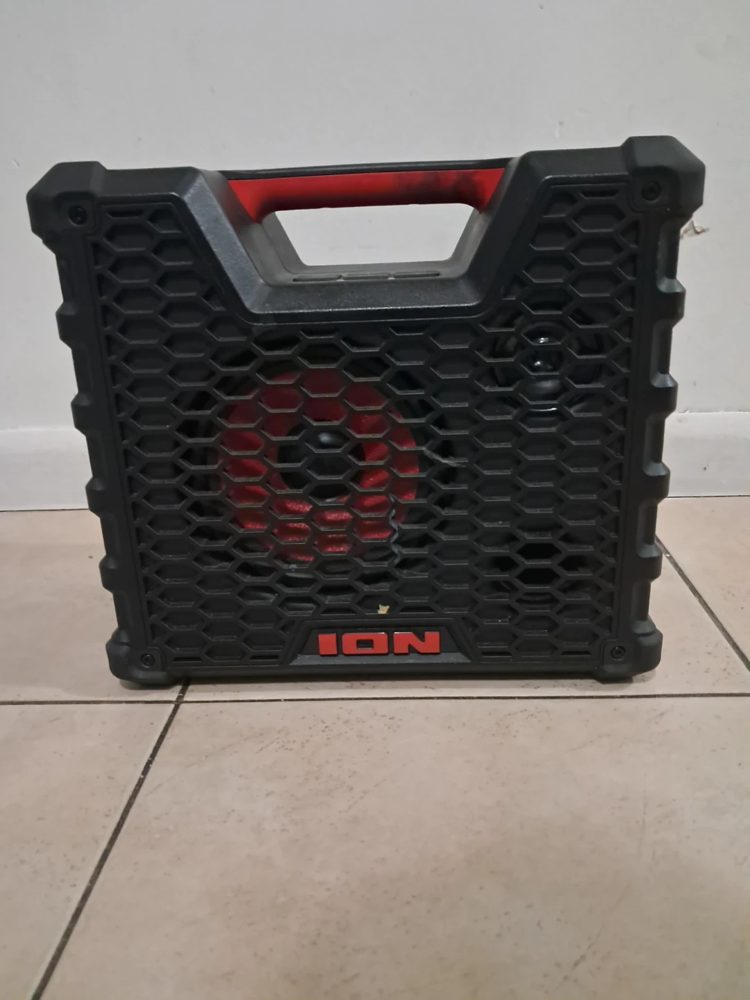 This is a portable Bluetooth speaker by ION. It has a red handle and black casing. Multiple input ports are available on the back.