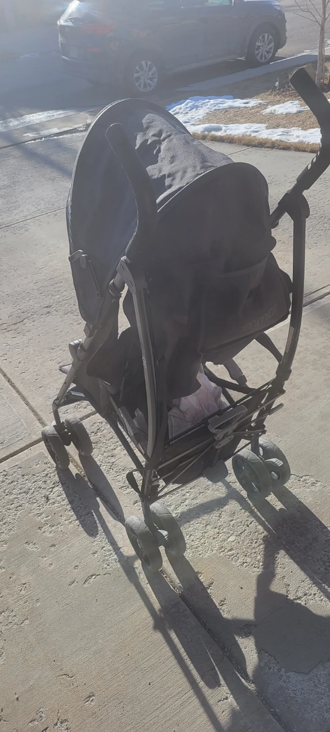 Lightweight black stroller with a canopy and safety harness. It's easy to fold for transport. Perfect for quick trips out and about!