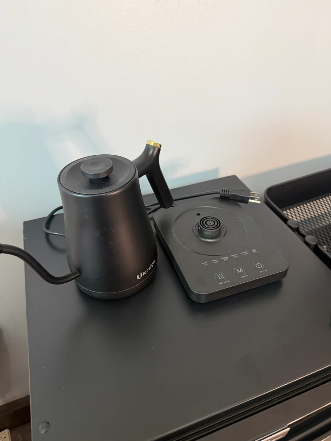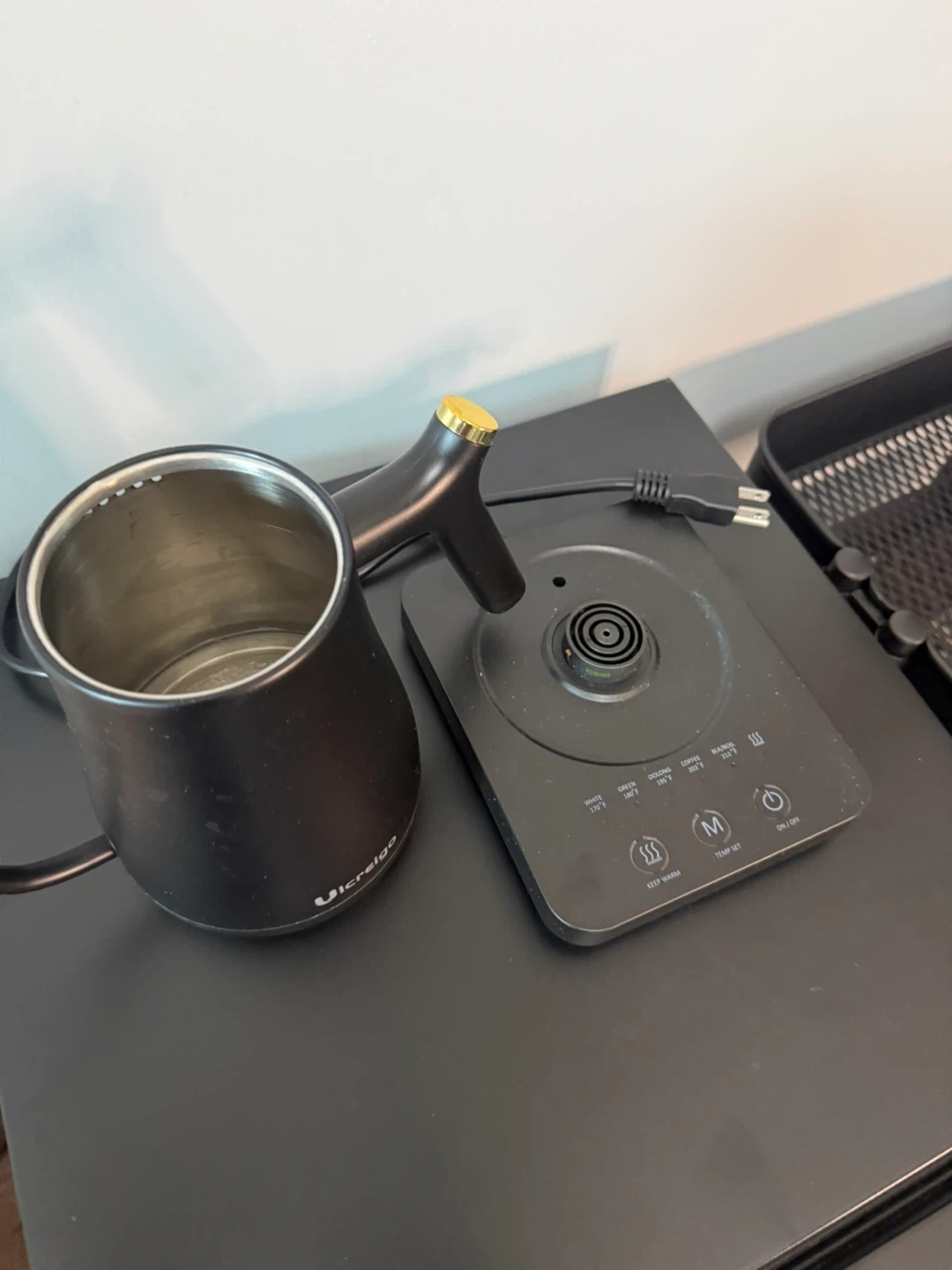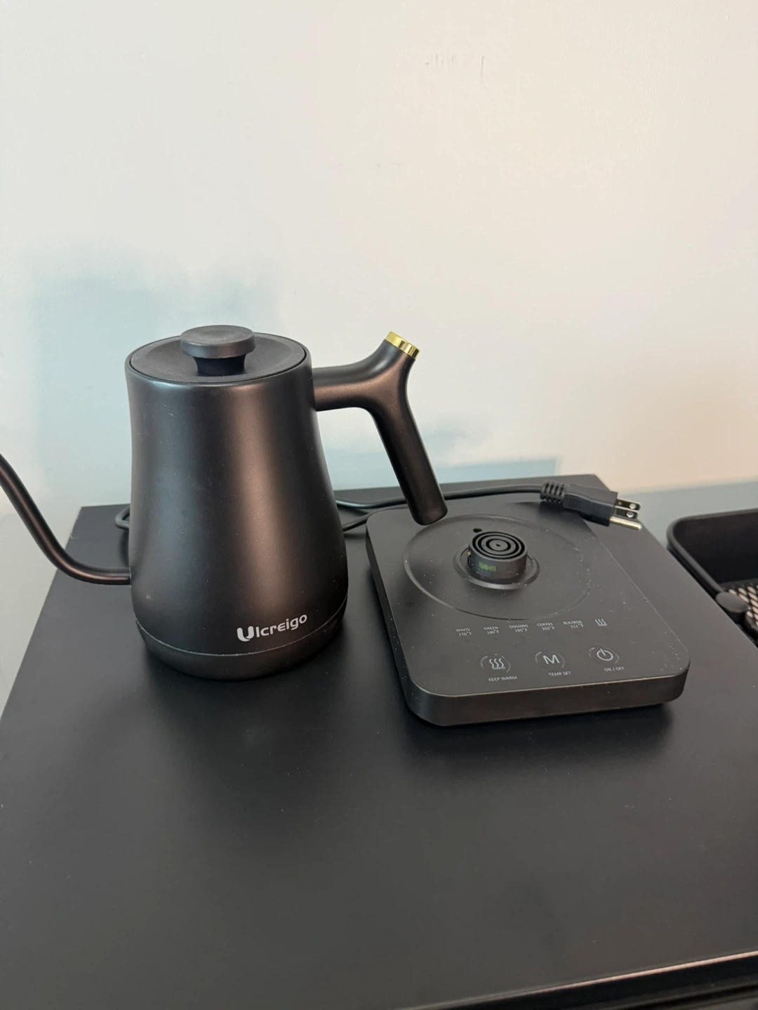 This is a black Ulcerigo electric gooseneck kettle. It features temperature control settings for precise heating. It's great for brewing coffee or tea at the perfect temperature. It comes with the base and power cord.
