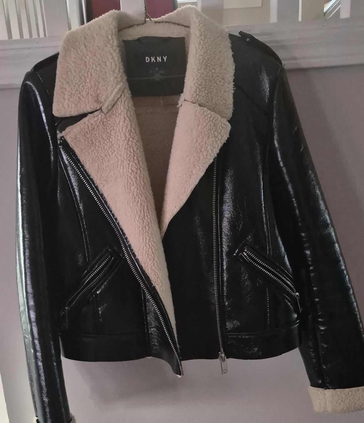 10Selling a DKNY black faux leather jacket with a cozy shearling lining! It's in great condition and perfect for adding a stylish edge to your wardrobe. The jacket features a classic moto style with zippered pockets and a comfortable fit. A great addition to any closet!