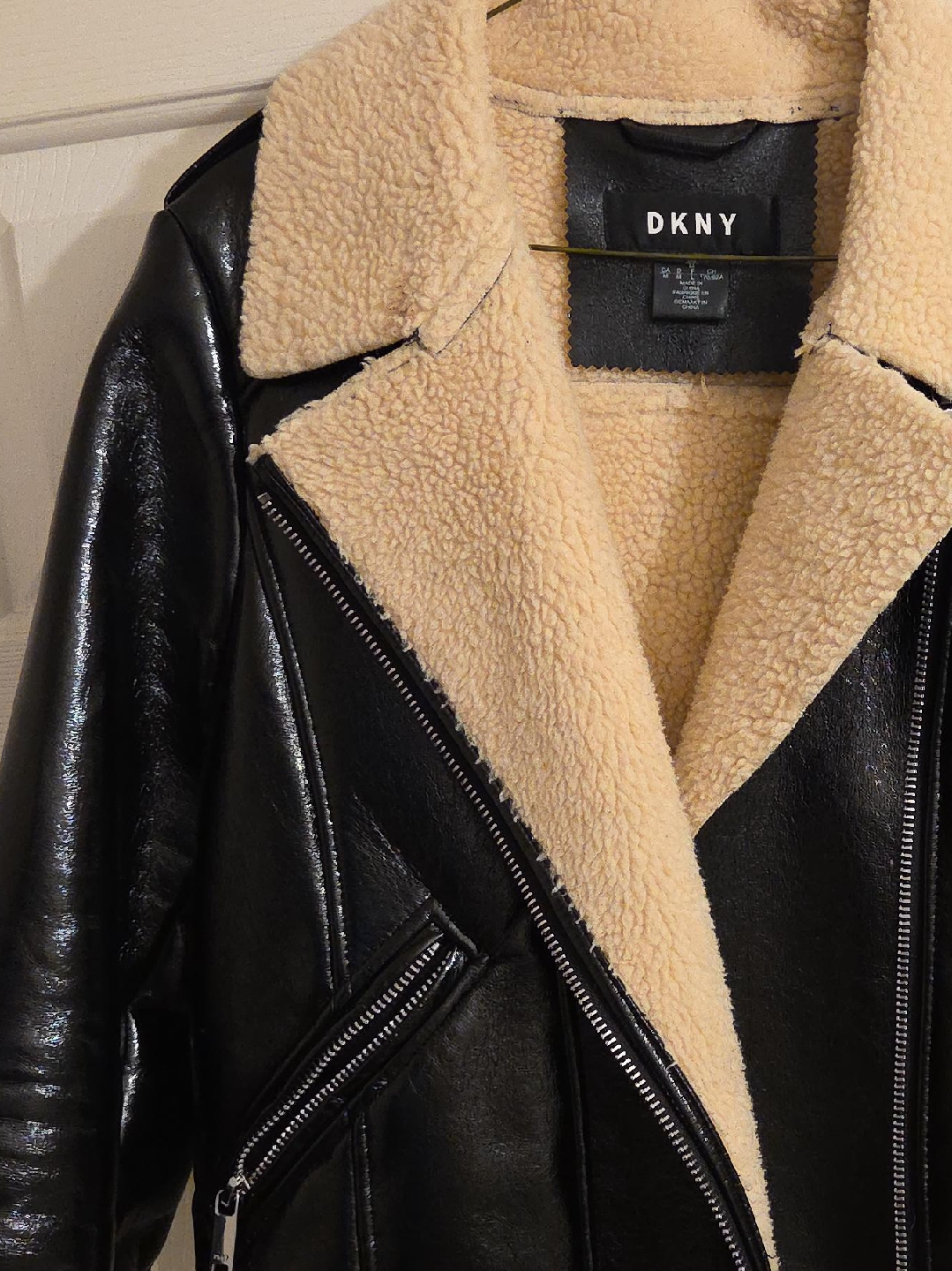5This is a DKNY black faux leather jacket with a sherpa lining. It's in great condition and would be perfect for fall or winter!