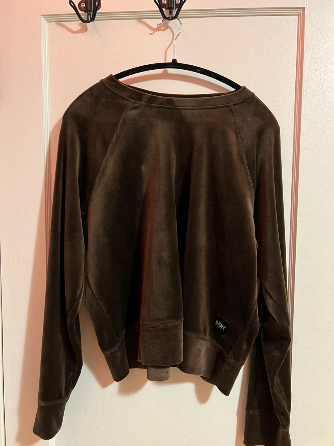 Here's a DKNY long-sleeve top made of a soft brown velvet material. It's in great condition and ready for a new home! Only worn once