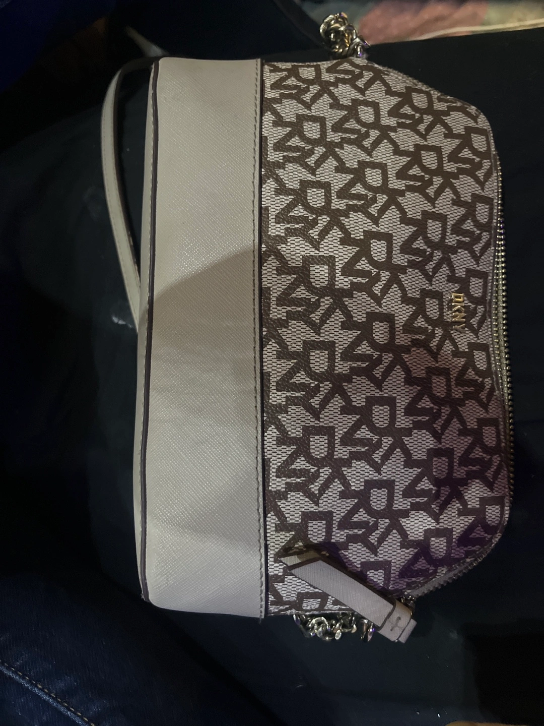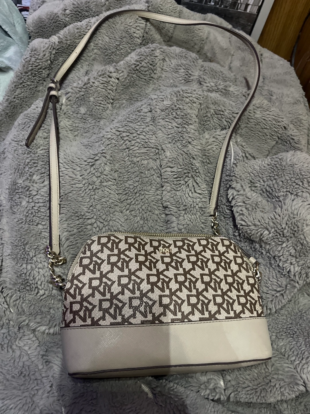 Selling a DKNY crossbody bag. It's in great condition and perfect for everyday use! The bag features a stylish design with the DKNY logo pattern and a convenient crossbody strap