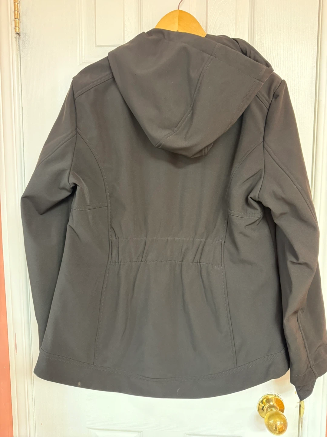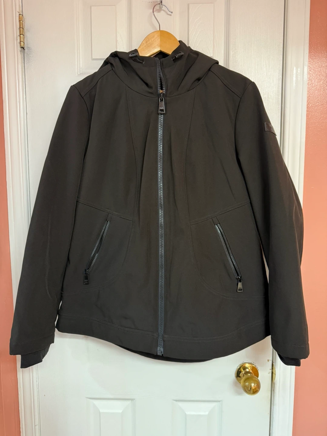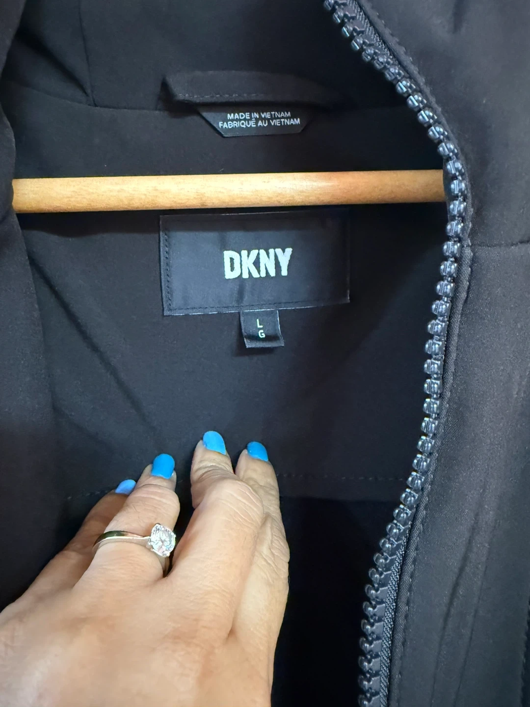 43Selling a DKNY women's hooded jacket in black. It's a size large. Great for everyday wear! Perfect for Fall and Spring