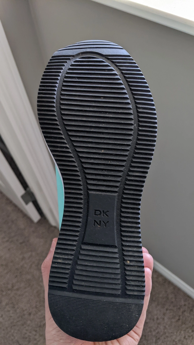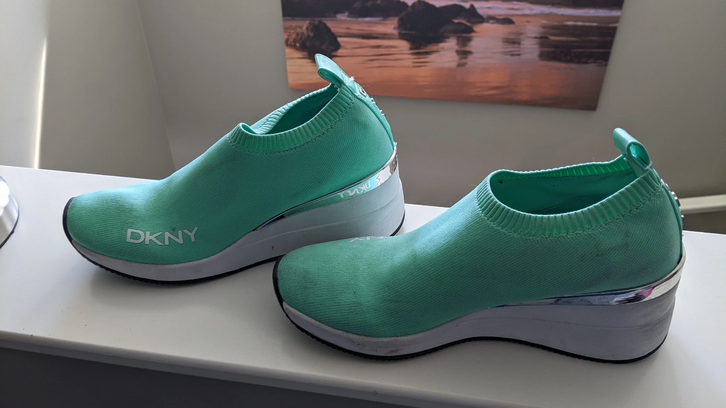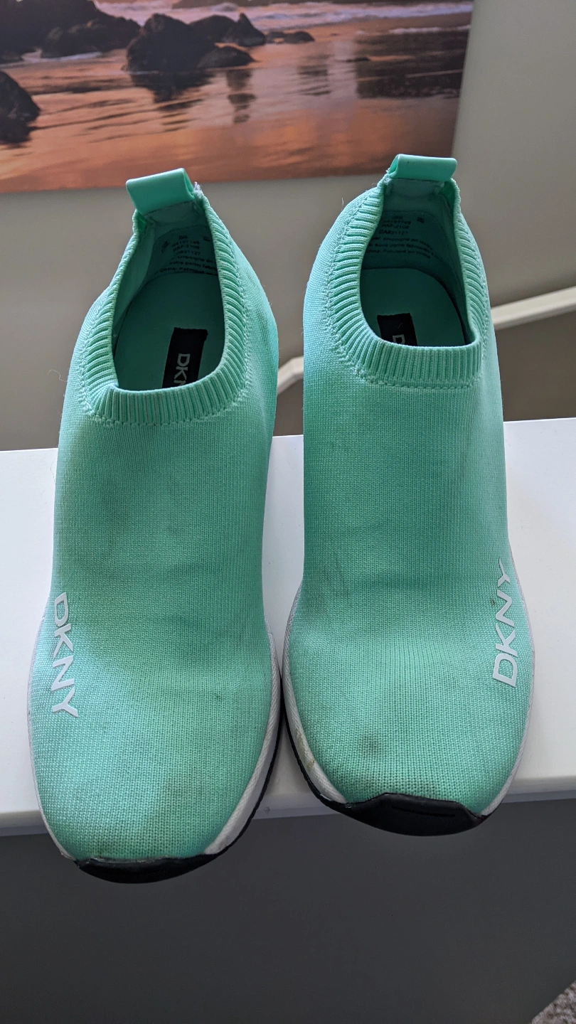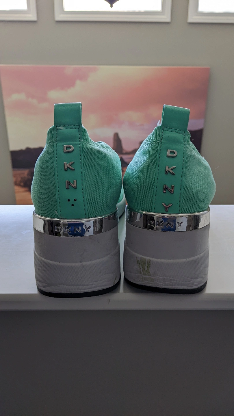 33Pair of mint green DKNY slip-on sneakers. Knit upper, wedge heel. Good pre-owned condition, some minor wear. Cash only, Location Silverado