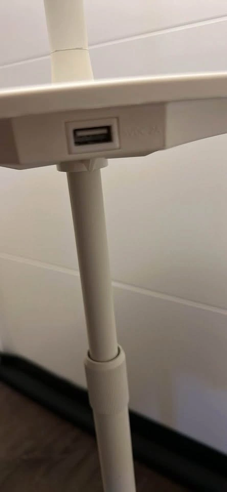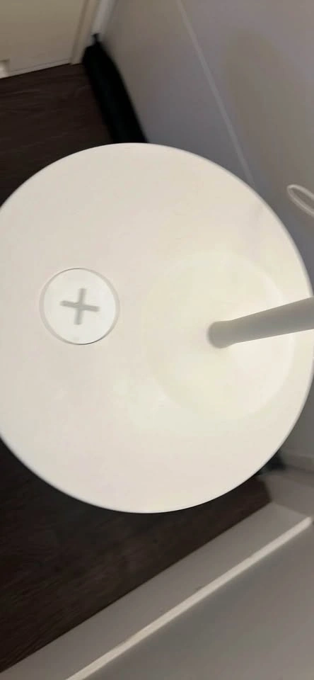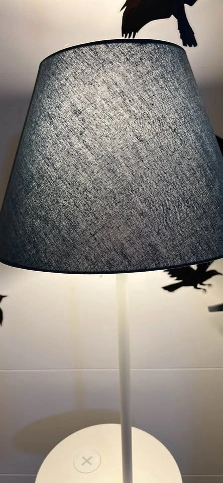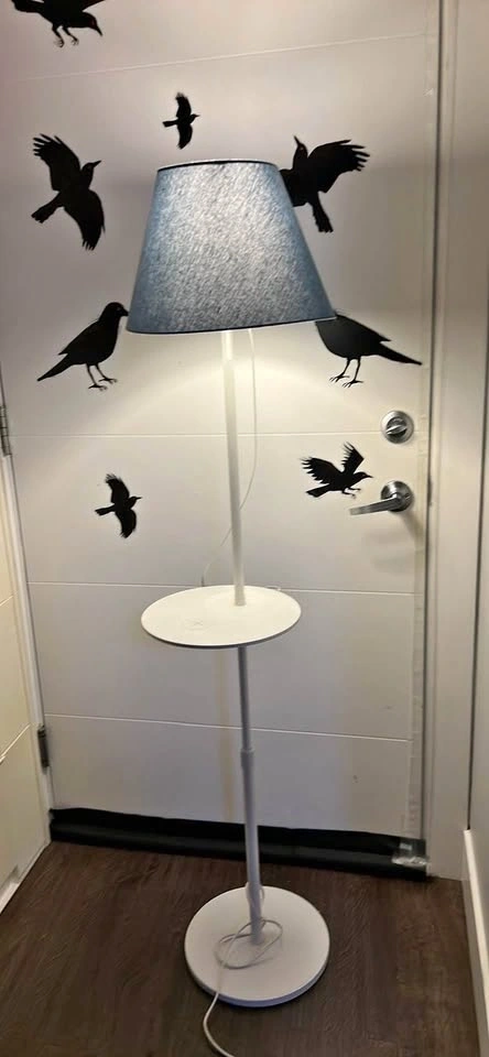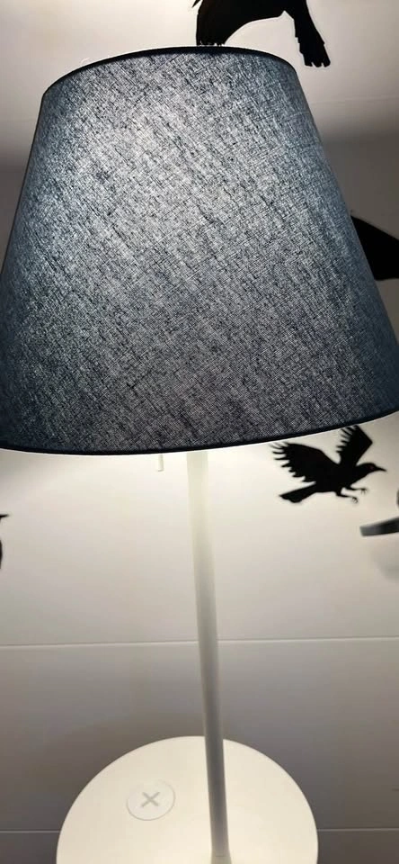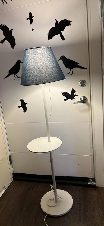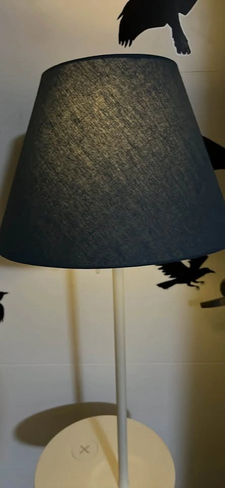 Upgrade your bedside or reading nook with this discontinued IKEA favorite. This isn't just a lamp—it’s a minimalist side table with a built-in Qi wireless charging pad and an additional USB port. Excellent, well-cared-for condition. Simply place your phone on the "+" sign to charge. No messy cables. Comes with the original blue tapered shade. Sturdy white powder-coated steel. Perfect for tight spaces where you don’t have room for a full nightstand.