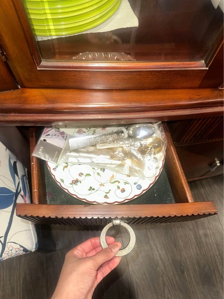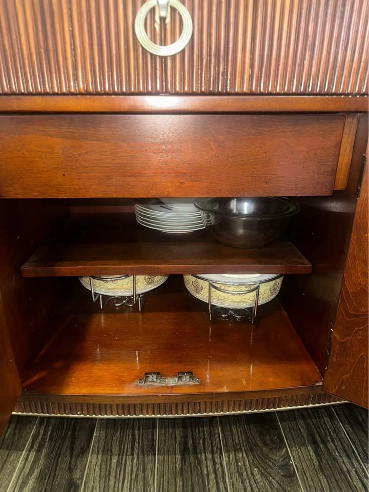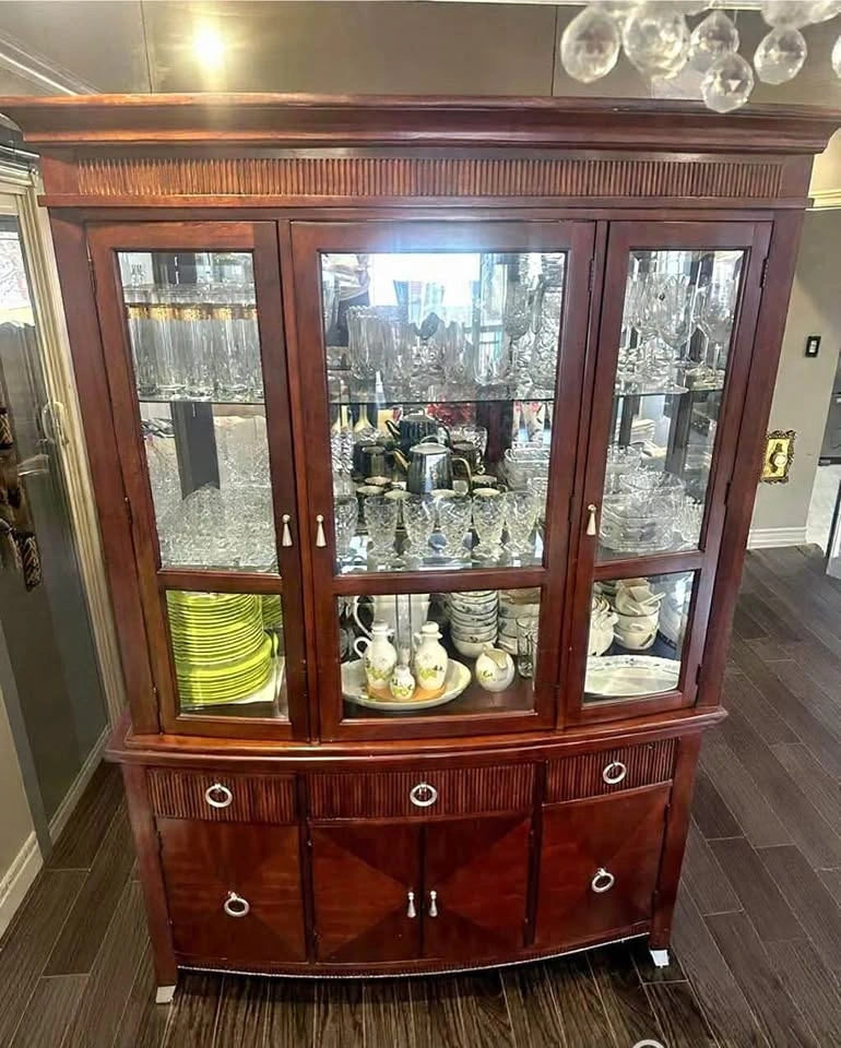 Absolutely stunning solid wood curved Italian cabinet/hutch with glass display doors and built-in shelving. The craftsmanship on this piece is next level with rich wood tones, elegant curved design, and detailed finishes that you simply do not see in modern furniture anymore.