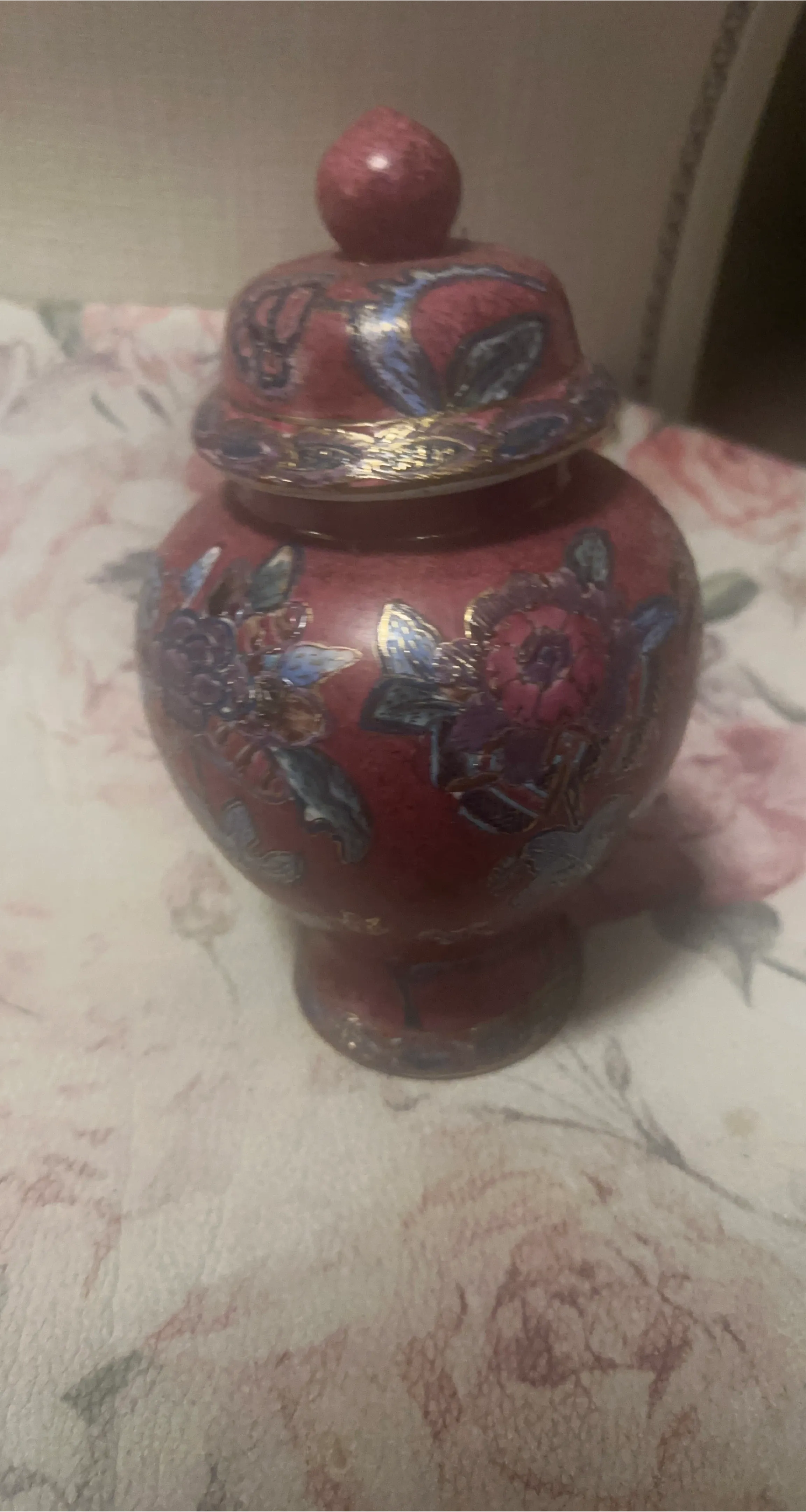 Selling a decorative red vase with a lid. It features a beautiful floral design with gold accents. It would be a lovely addition to any room!