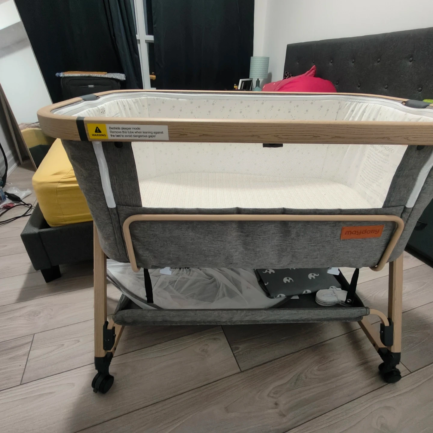 Maydolly 3-in-1 Baby Bassinet Bedside Crib, 6-Height Adjustable Bedside Sleeper with Airflow Mesh, Storage Basket & Lockable Castors, Upgraded Trapezoidal Cradle for Newborns.