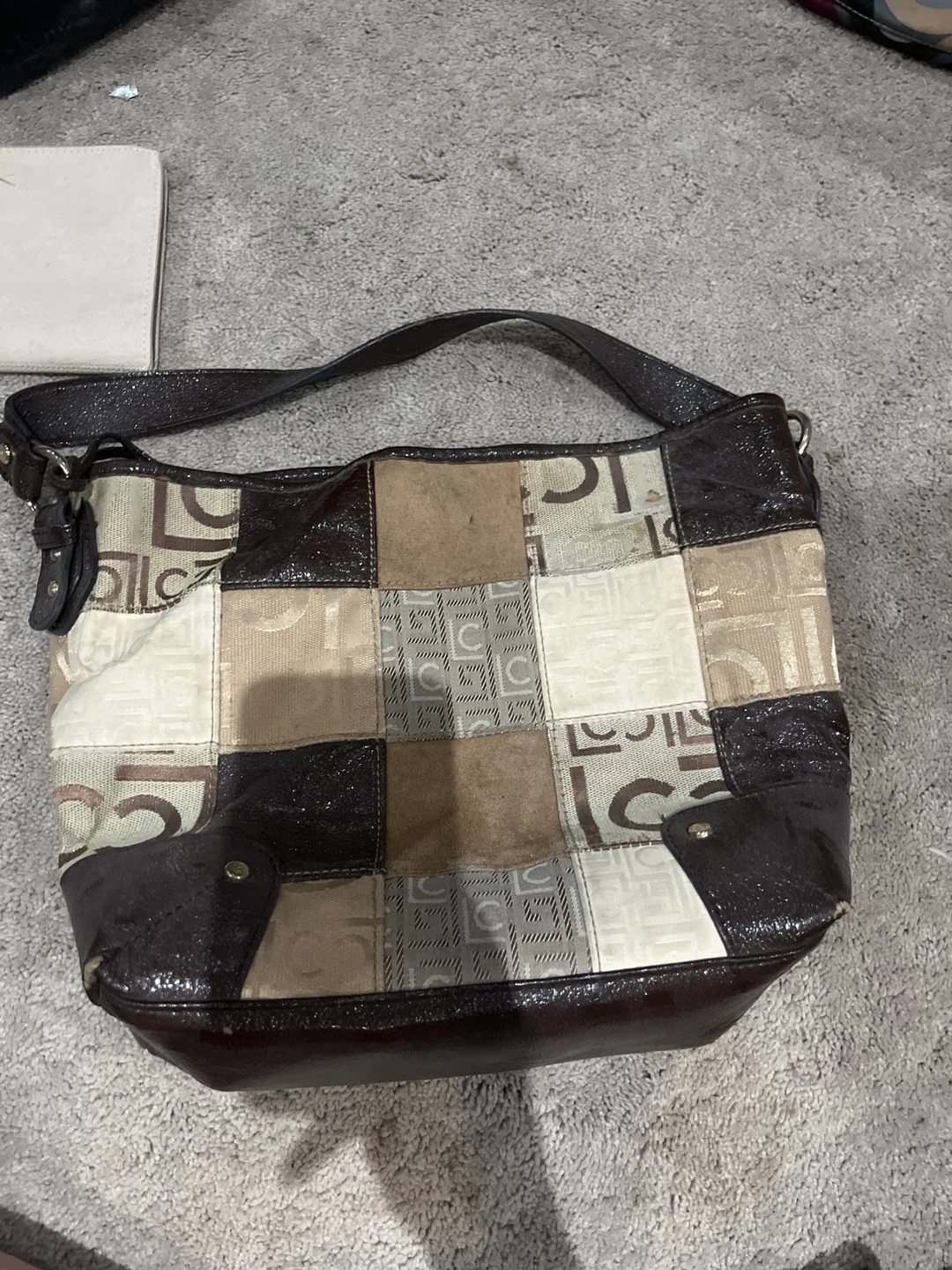 Stylish Liz Claiborne hobo bag with a patchwork design. It features multiple interior pockets for organization. A great bag for everyday use!