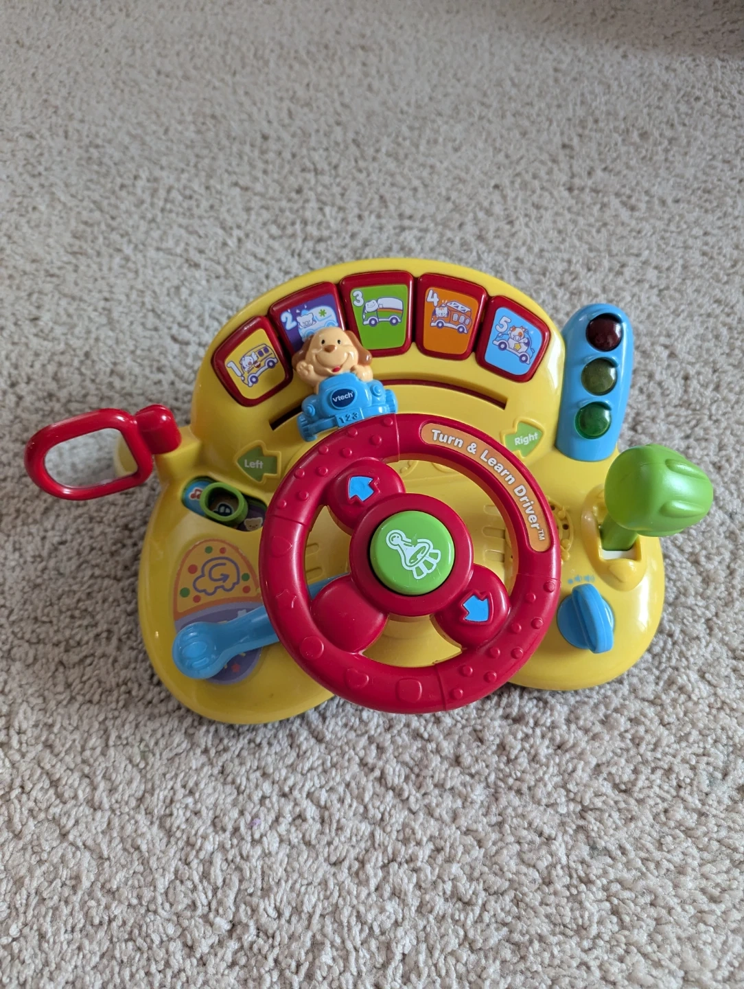 This VTech Turn & Learn Driver toy is designed for little ones. It features interactive buttons and a steering wheel that spins for pretend play. The colourful lights and sounds encourage early learning.