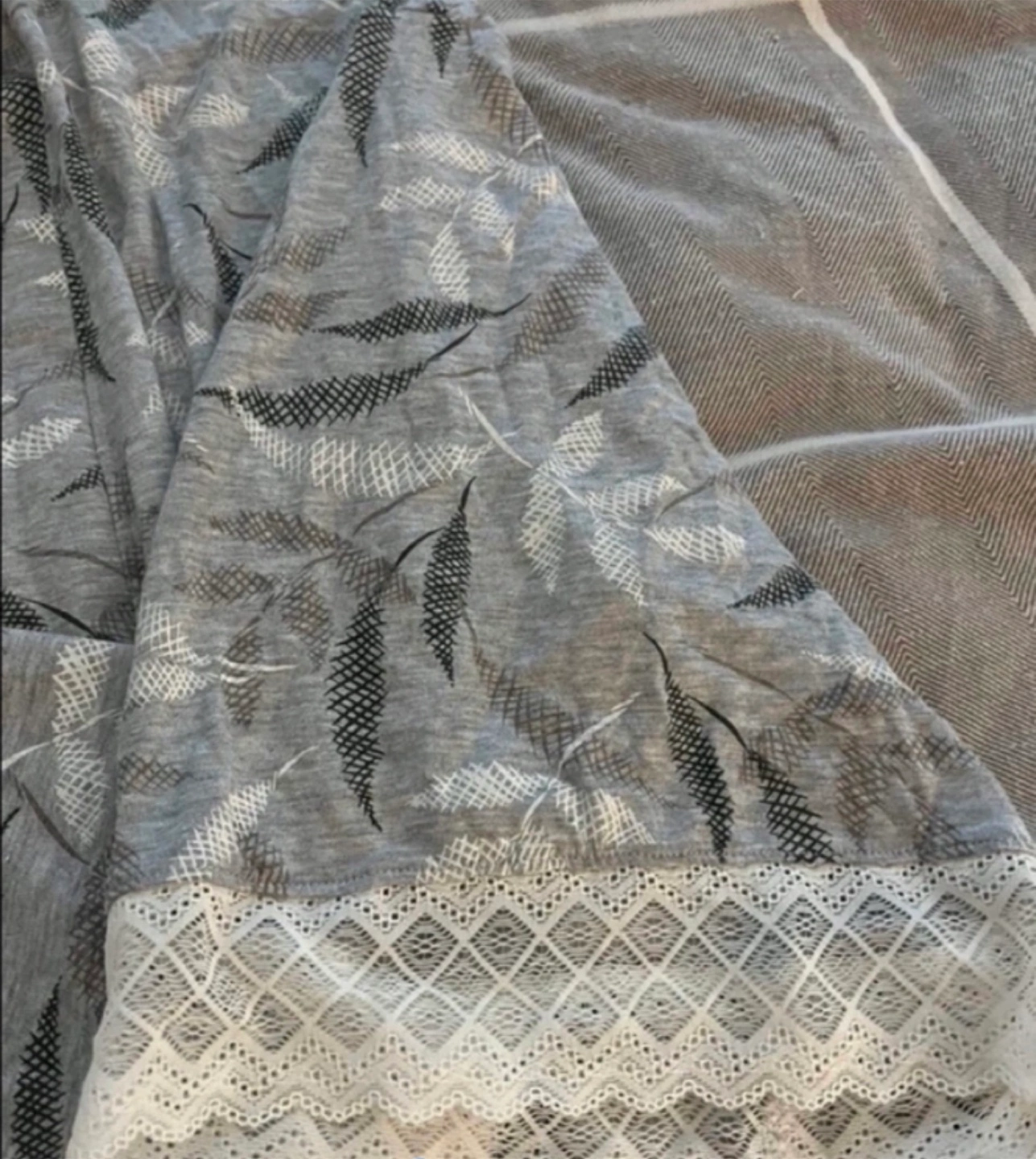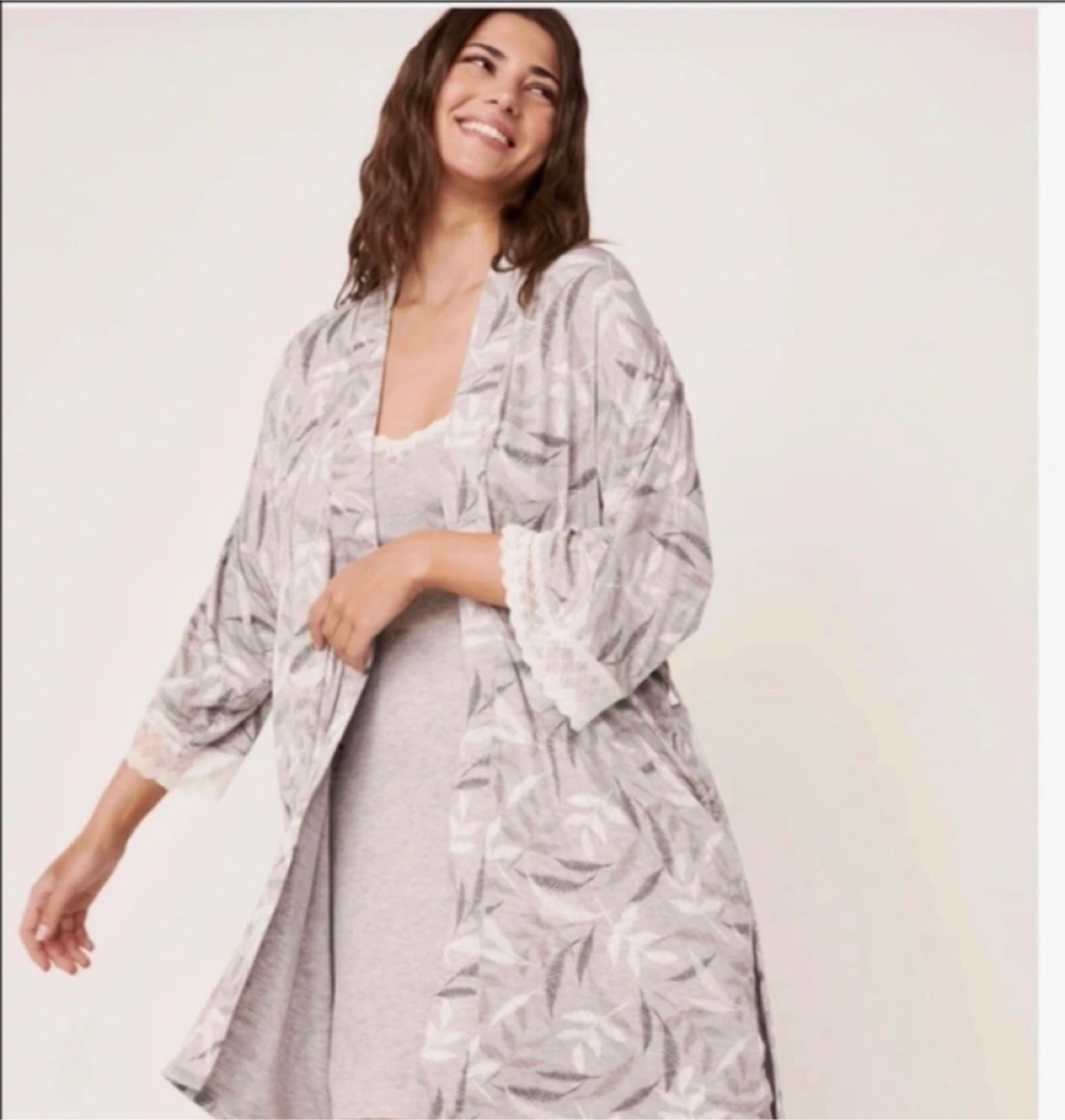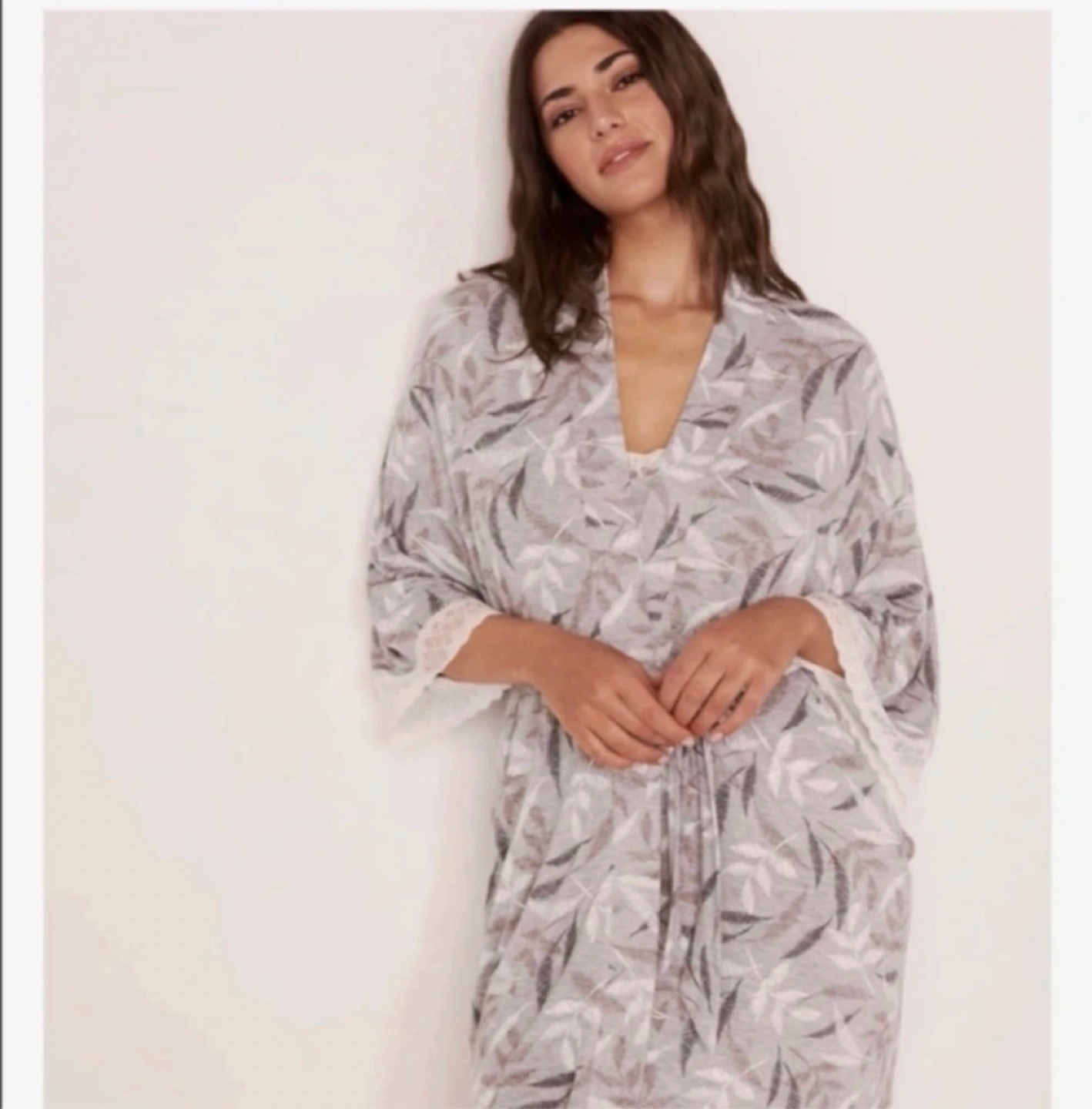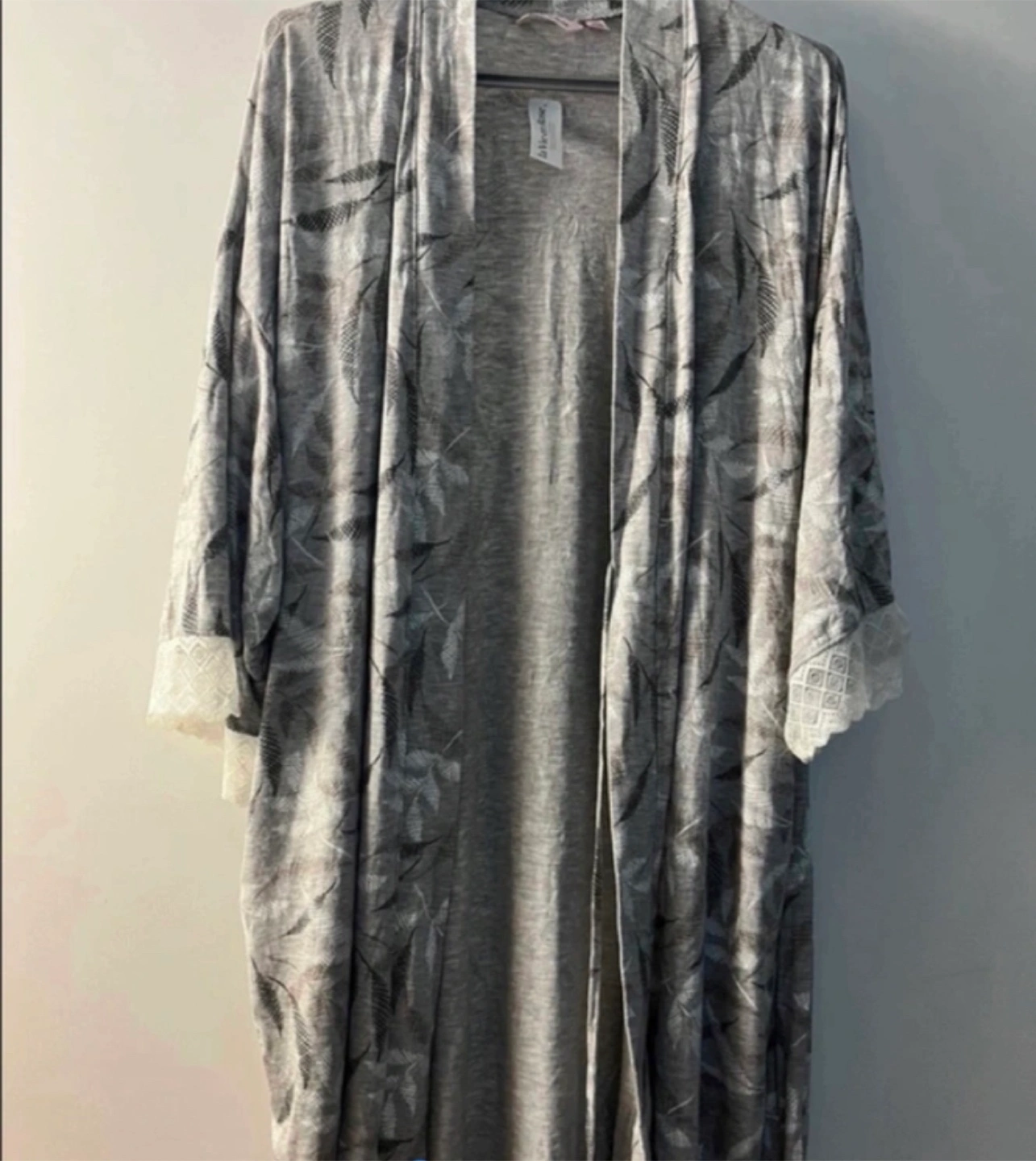 Gorgeous grey kimono robe. Features a leaf print and lace detailing on the sleeves. Lightweight and comfortable. Perfect for lounging.