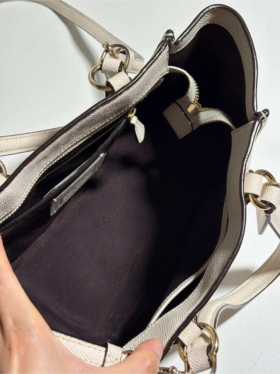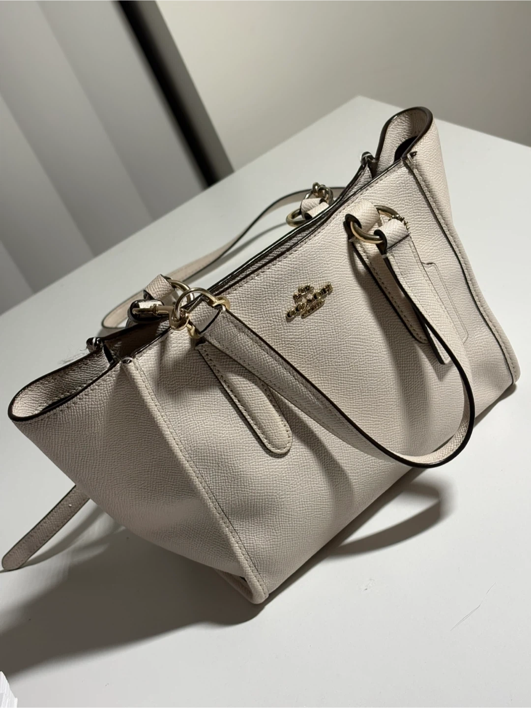This is a Coach pebble leather tote bag in a cream colour. It has a spacious interior with a zippered pocket. The bag's textured leather offers durability.