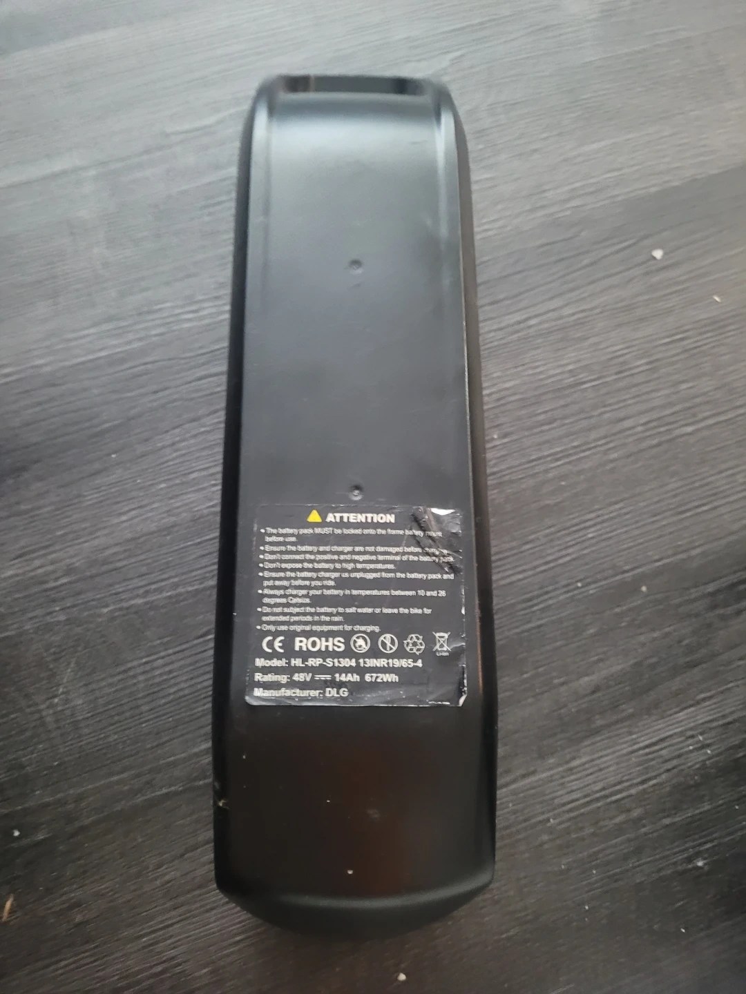 78Selling a DLG e-bike battery. The model number is HL-RP-S1304 13INR19/65-4. It's rated at 48V and 14Ah with 672Wh.