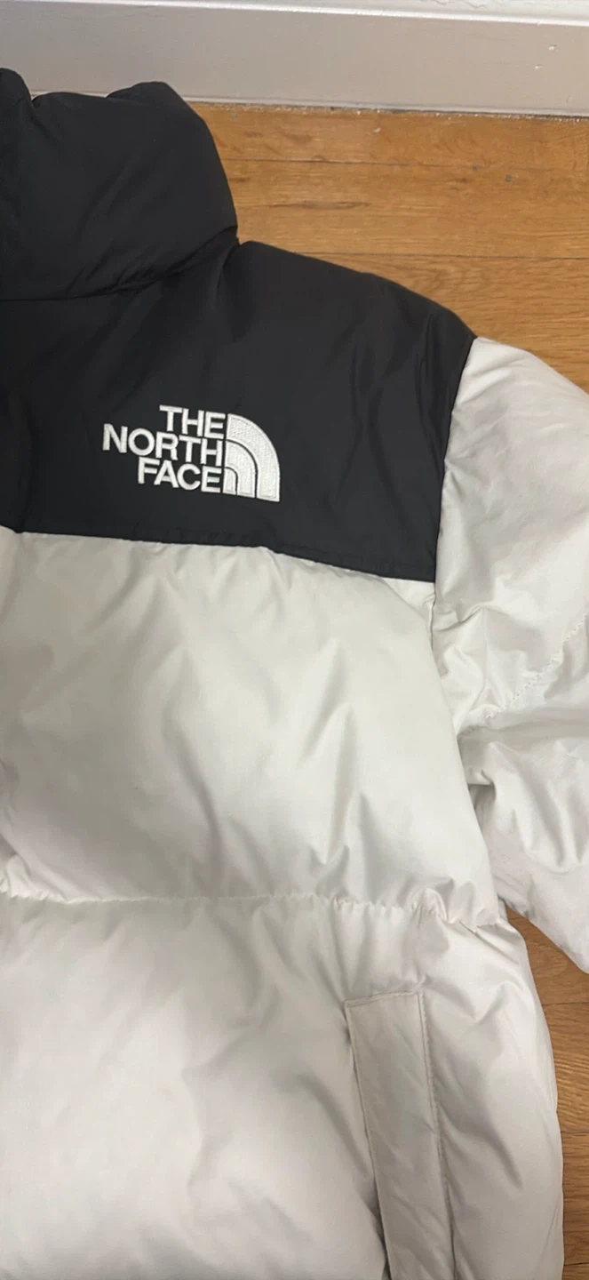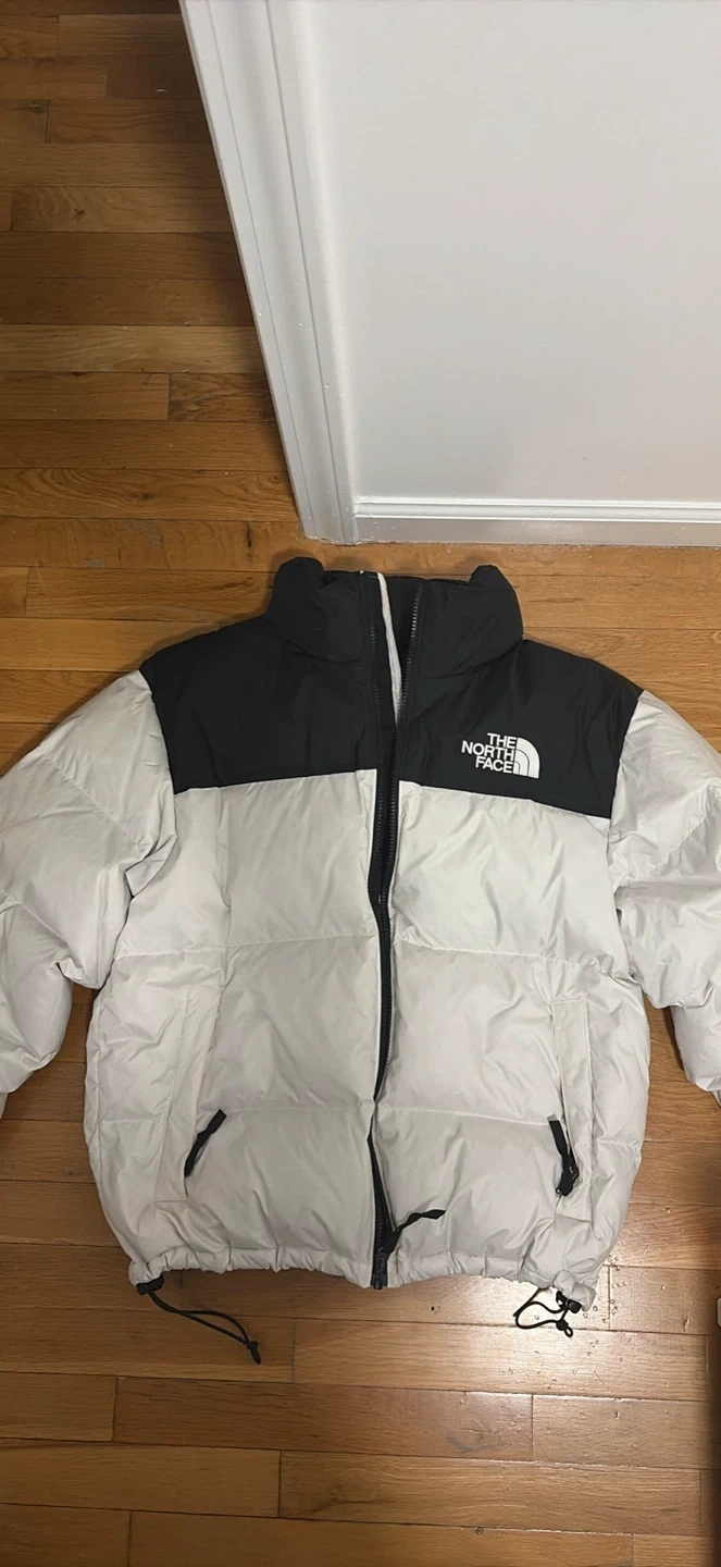 This is a puffer jacket from The North Face. It features a black and white color block design. It's made for cold weather protection.