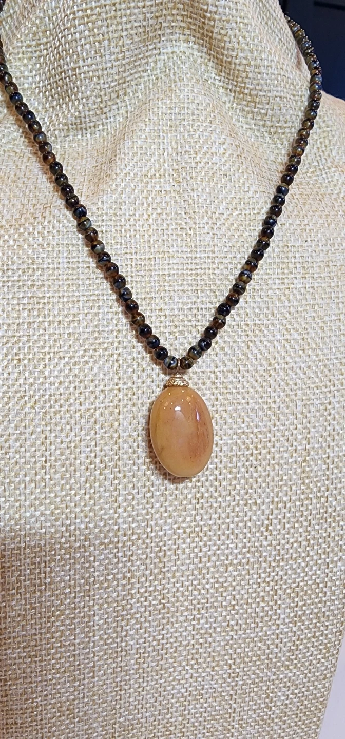 Lovely handmade necklace featuring a strand of dark, shimmering beads and a smooth amber-tone oval pendant. The pendant catches the light beautifully — a subtle, earthy statement piece that works beautifully with casual or dress outfits.