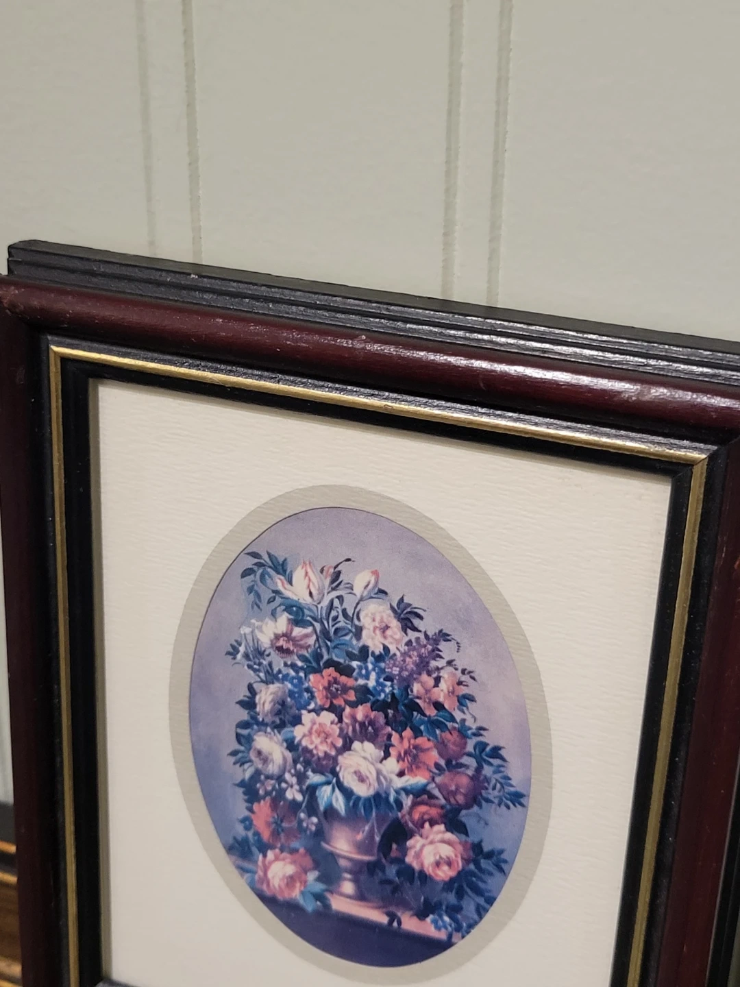 This is a framed floral print. It has a beautiful and classic design that would complement any room. The print is in good condition, with a well-maintained frame, adding a touch of vintage charm to your home decor.