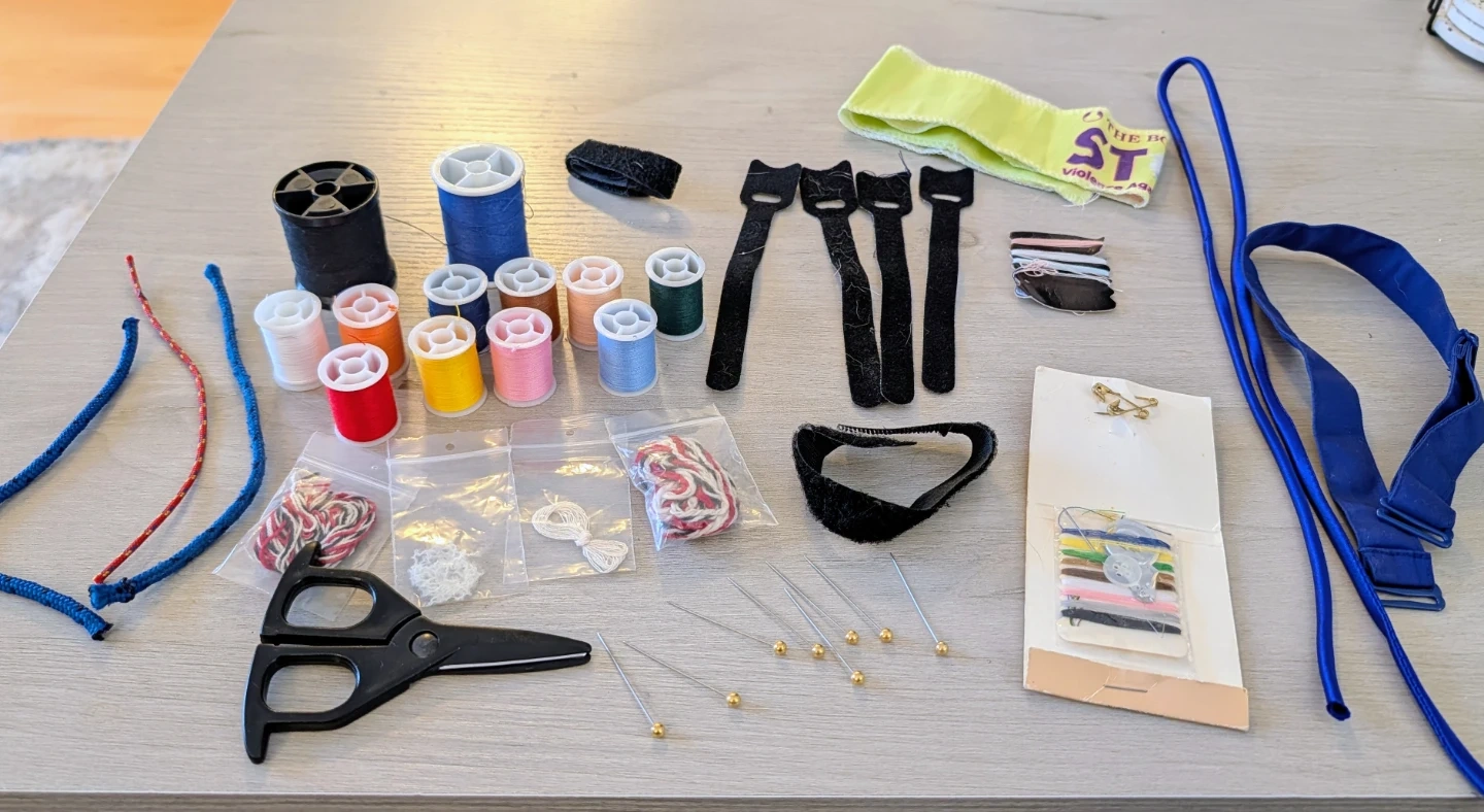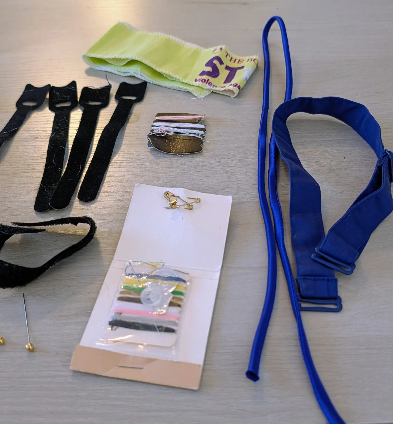 This sewing kit includes various threads, needles, pins, scissors, and fasteners. It also comes with a blue bra strap and a green elastic band with "ST" printed on it. Ideal for mending or customising apparel.