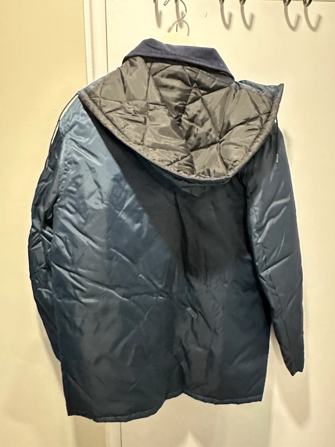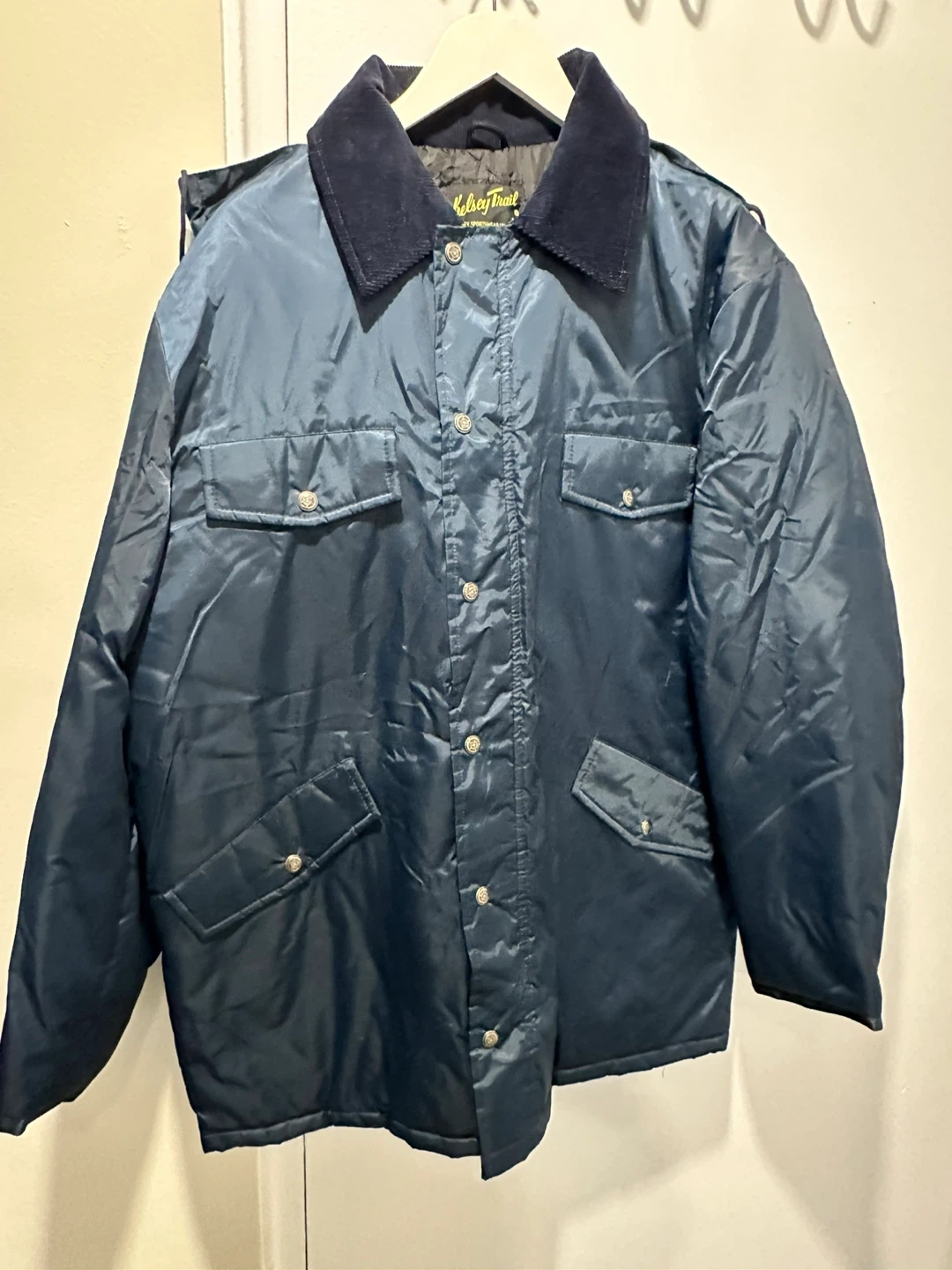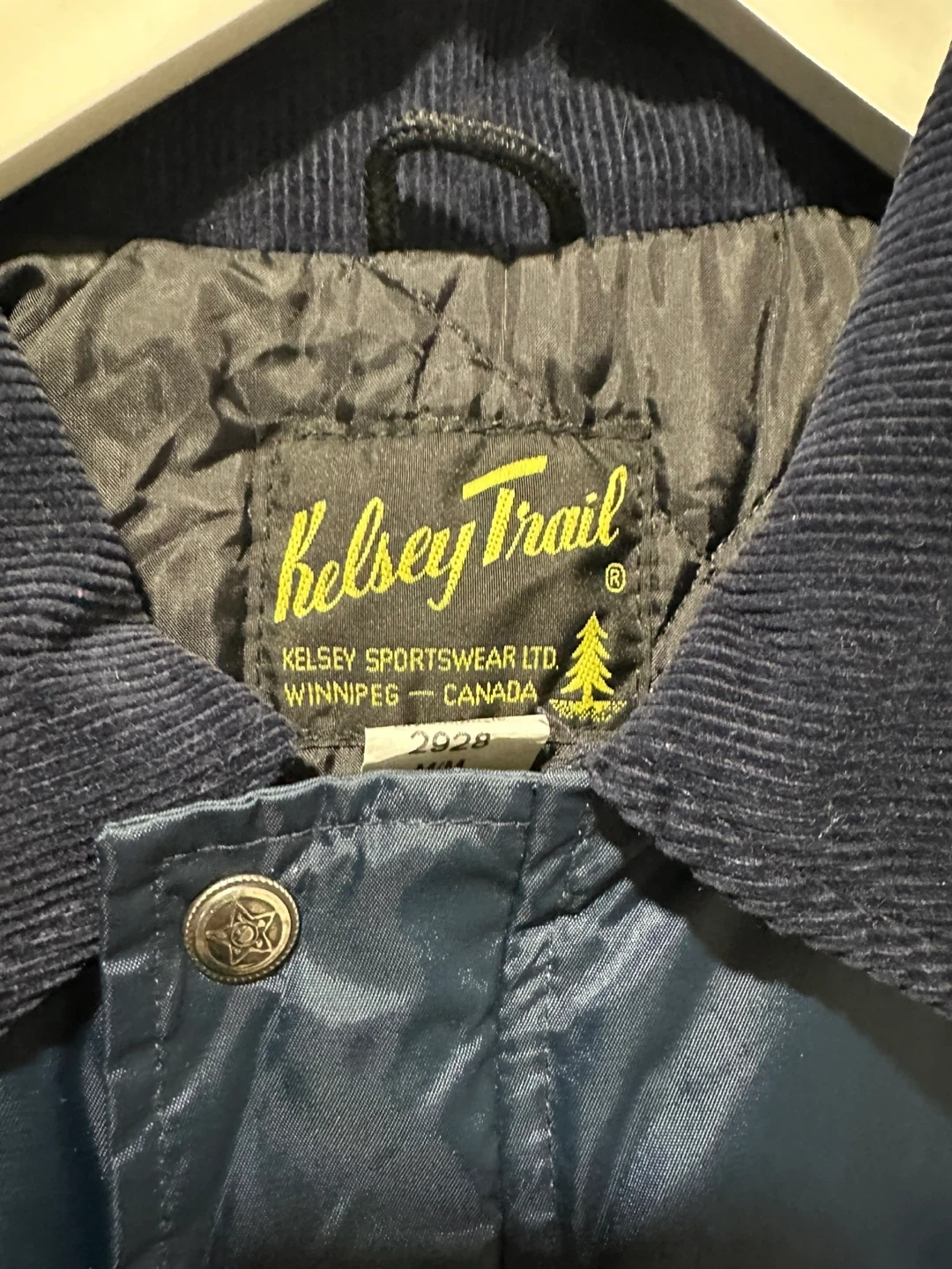 A navy Kelsey Trail insulated jacket with a quilted lining. Features two chest pockets and two lower pockets with snap closures. The collar is made of corduroy. Size is M.