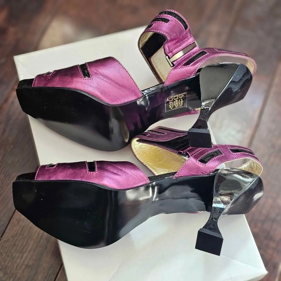Stunning and rare brand new in box John Fluevog Compulsion platform sandals from the iconic Memories family, in the highly sought-after Metallic Purple and Black colorway. They give major Y2K retrofuturism, avant-garde and dark coquette vibes.
