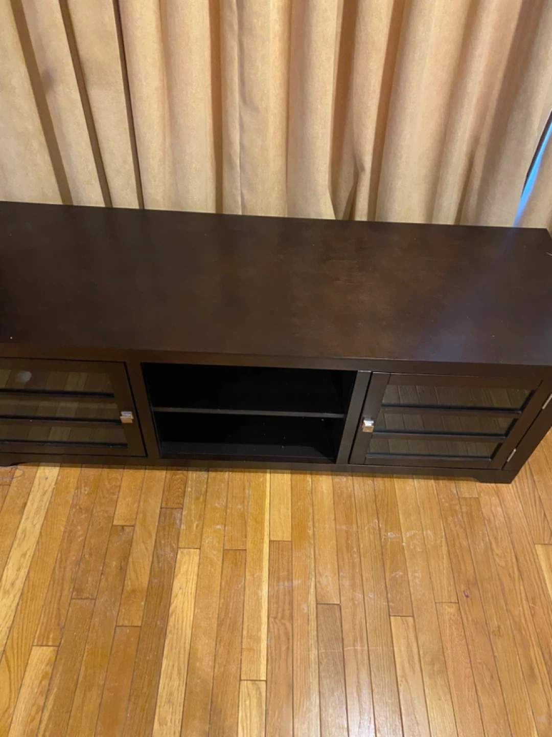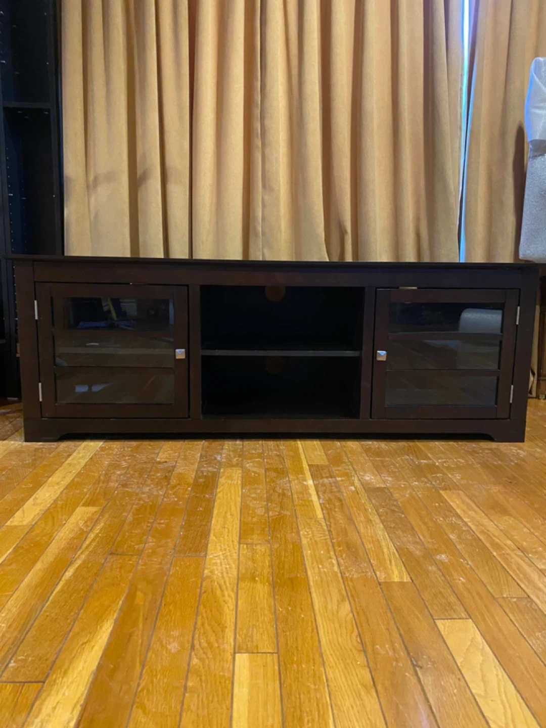 This media console is a rich dark brown colour and features glass-fronted cabinets. It has a central open shelf for electronics. It's great for organizing your entertainment setup. The console offers plenty of storage space!