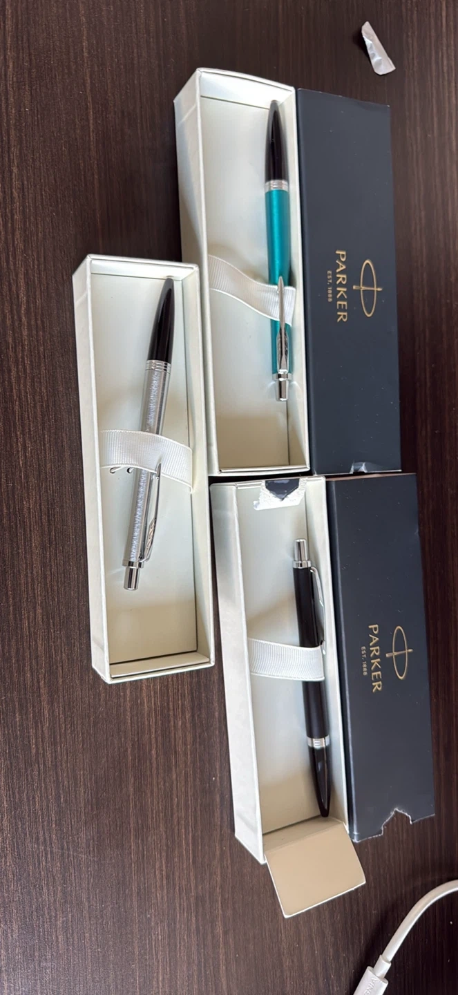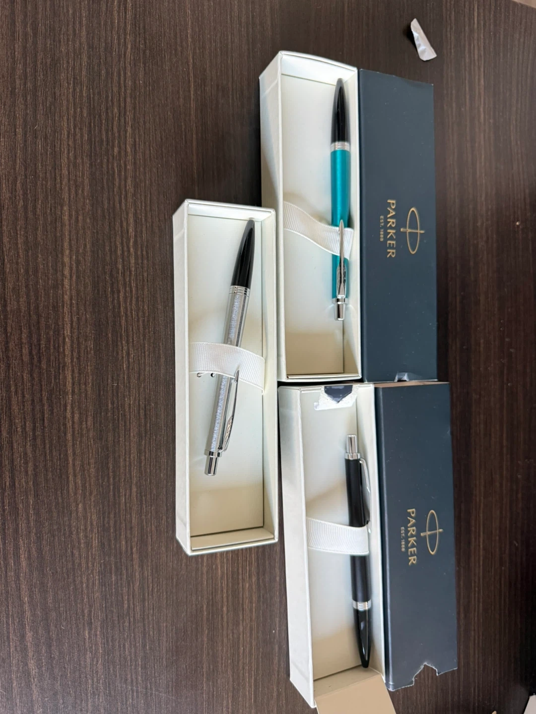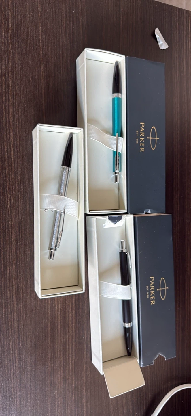Three Parker pens in teal, black, and silver finishes. Each pen comes in its original box. These pens are great for everyday use or as a gift.