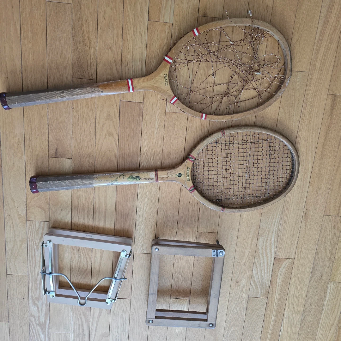 Two wooden tennis rackets, one branded "JUNIOR". Includes two stringing clamps. These are vintage items, perfect for display or for a collector.