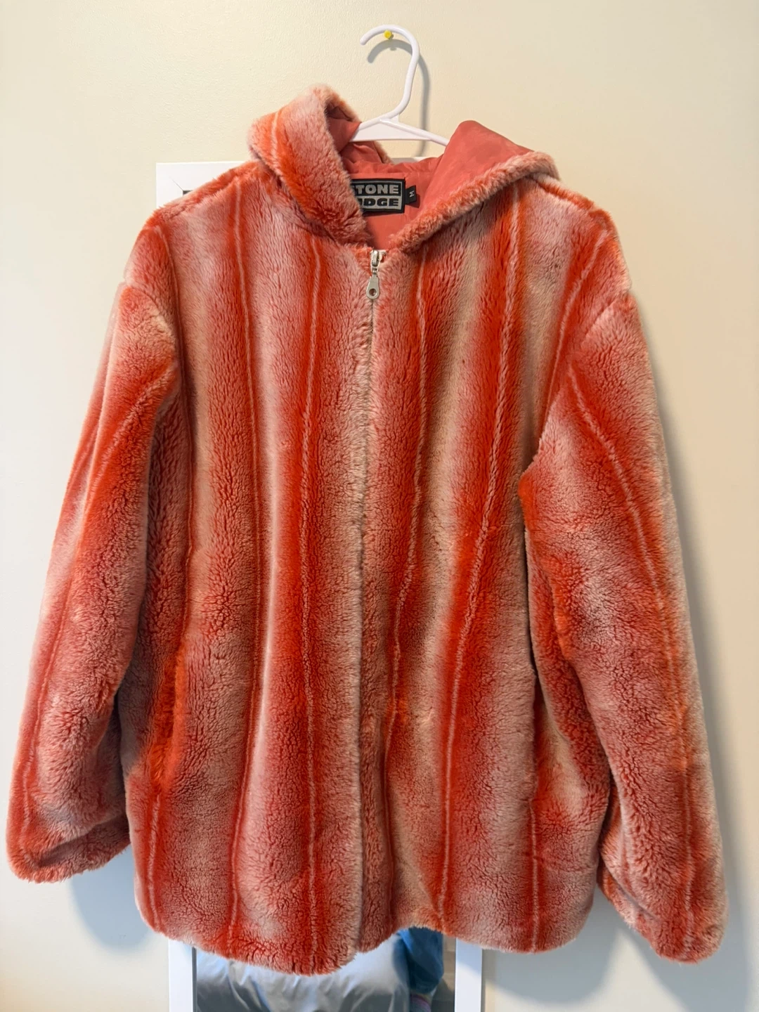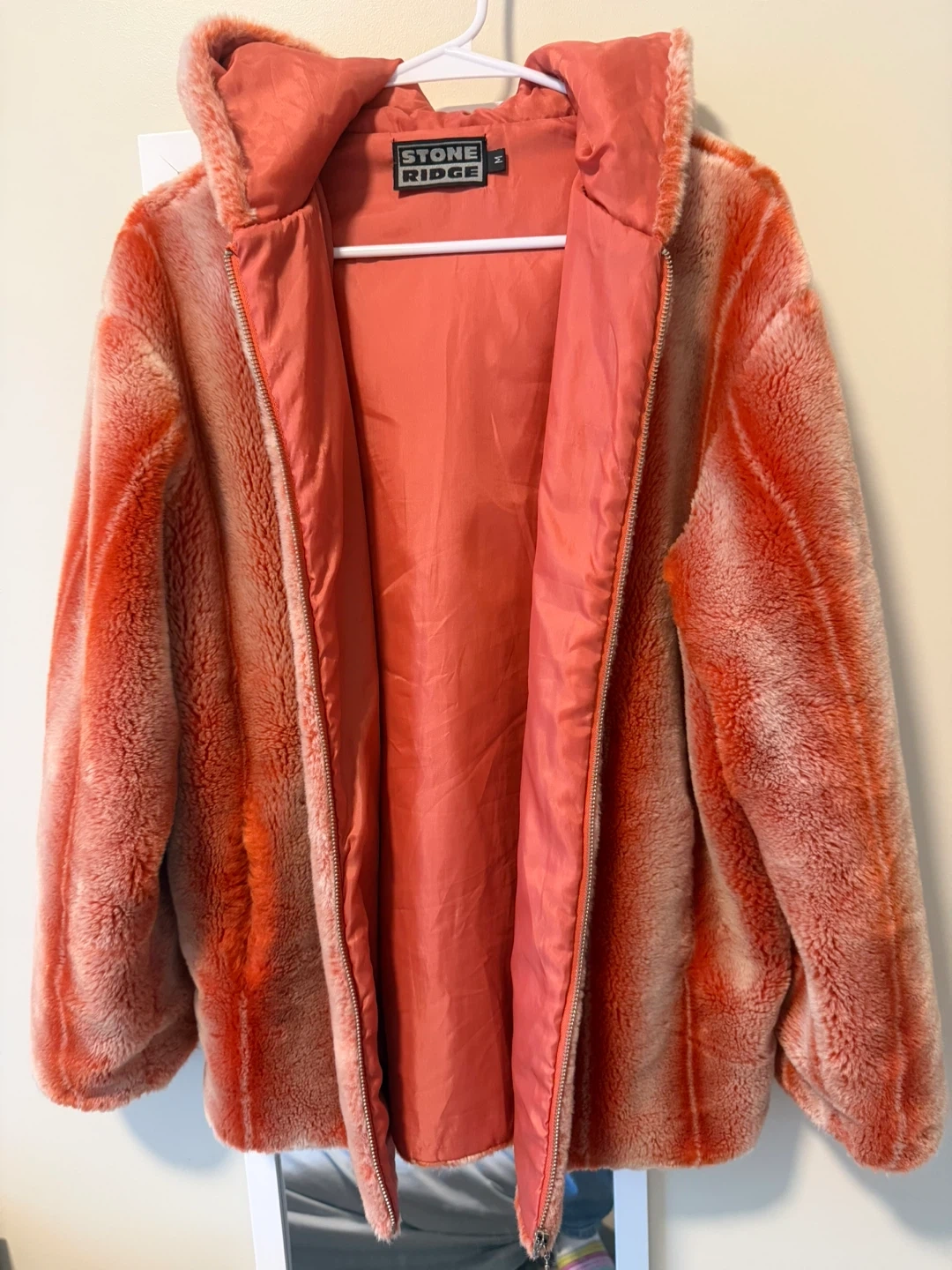 Stone Ridge faux fur hooded jacket! With pockets. It's a size medium and features a soft, plush texture with a stylish hooded design. Perfect for adding a touch of warmth and flair to your wardrobe.