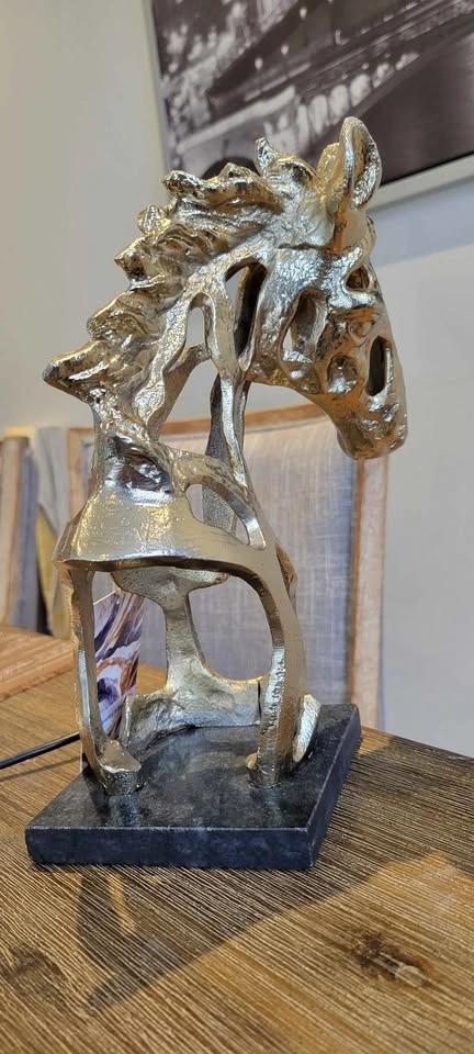 Elevate your decor with this stunning abstract horse sculpture in a beautiful gold finish. Condition: Excellent, like new. Material: High-quality polyresin or aluminum with a polished gold finish. Dimensions: Approximately 10 inches (height) x 5 inches (width) x 4 inches (depth). Design: Features a unique, hollow spiral design and sits on a solid black base, offering a contemporary art deco style. This eye-catching piece is perfect for a desk, bookshelf, or as an elegant accent in any room. Local pickup available in Oakville. Cash or e-transfer preferred.