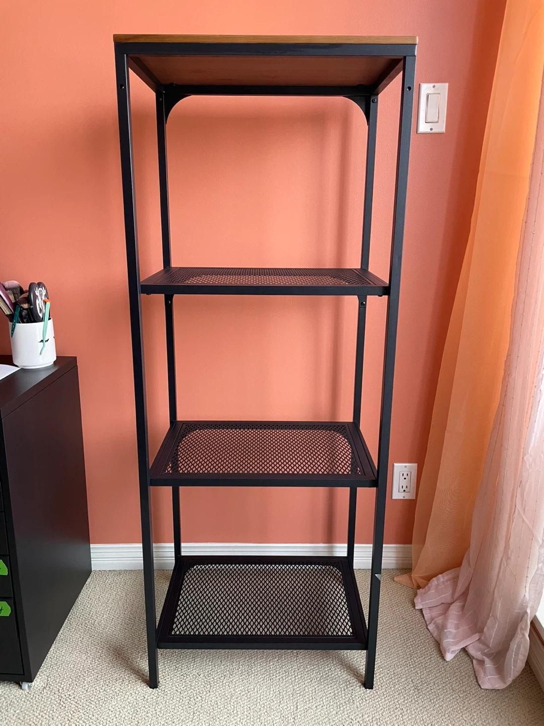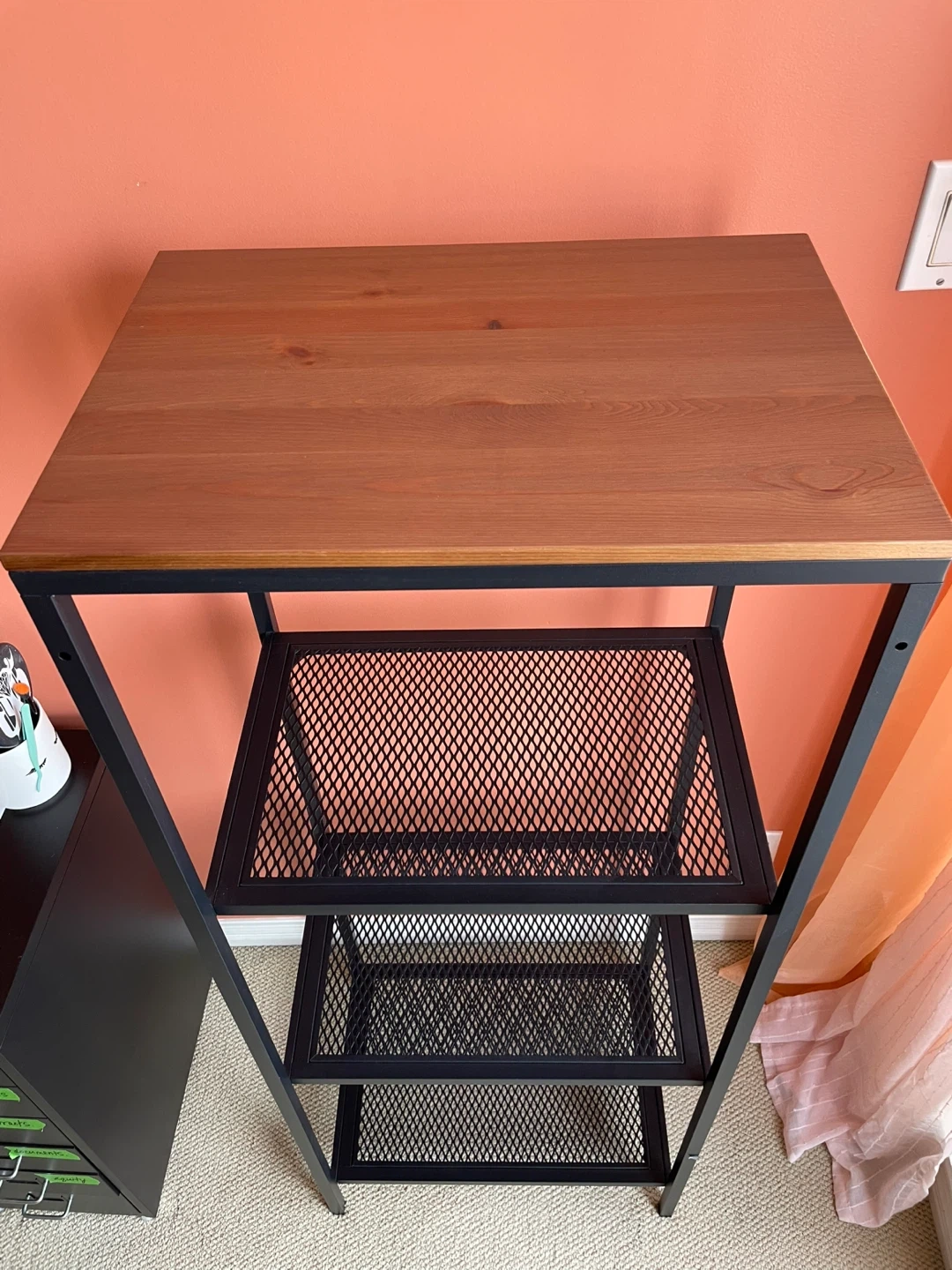 A tall shelf unit with a wood top and three metal mesh shelves. Its open design and modern look work in most rooms. It's great for storing books, decor, or plants.