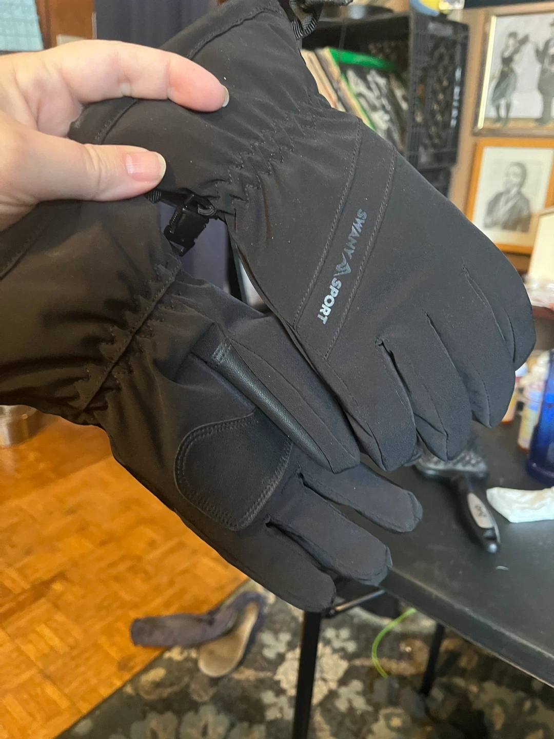 Black Swany Sport hybrid gloves. Water-resistant shell with padded palm. Adjustable wrist strap and elastic cuffs included. Great for cold weather activities!