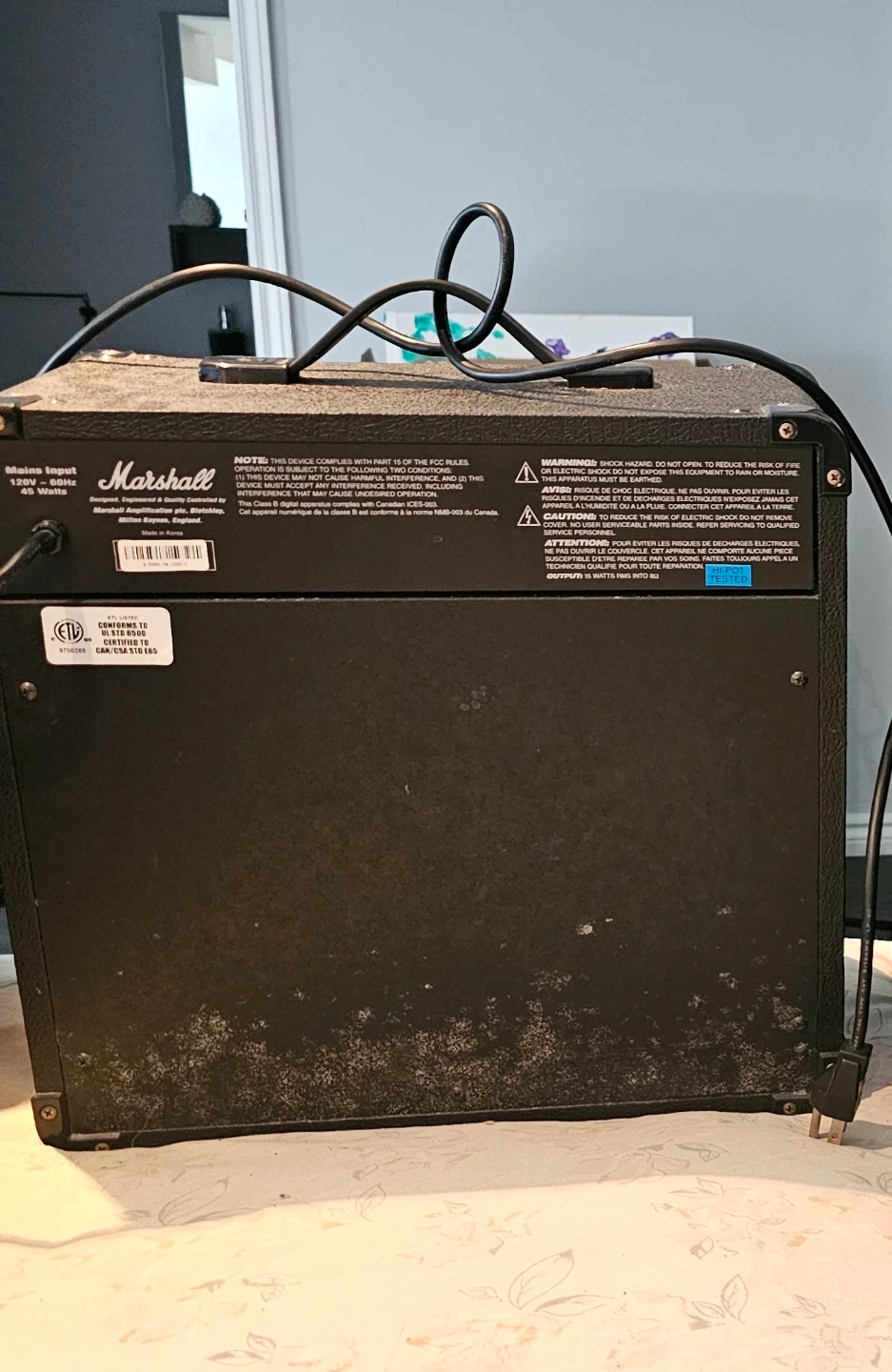 Marshall MG15FX 15 Watt guitar combo amplifier. It's designed, engineered, and quality controlled by Marshall Amplification plc, England. Features Clean, Overdrive, Bass, Middle, Treble, Reverb, and FX controls. Made in Korea. Power output is 15 watts. Will entertain reasonable offers.