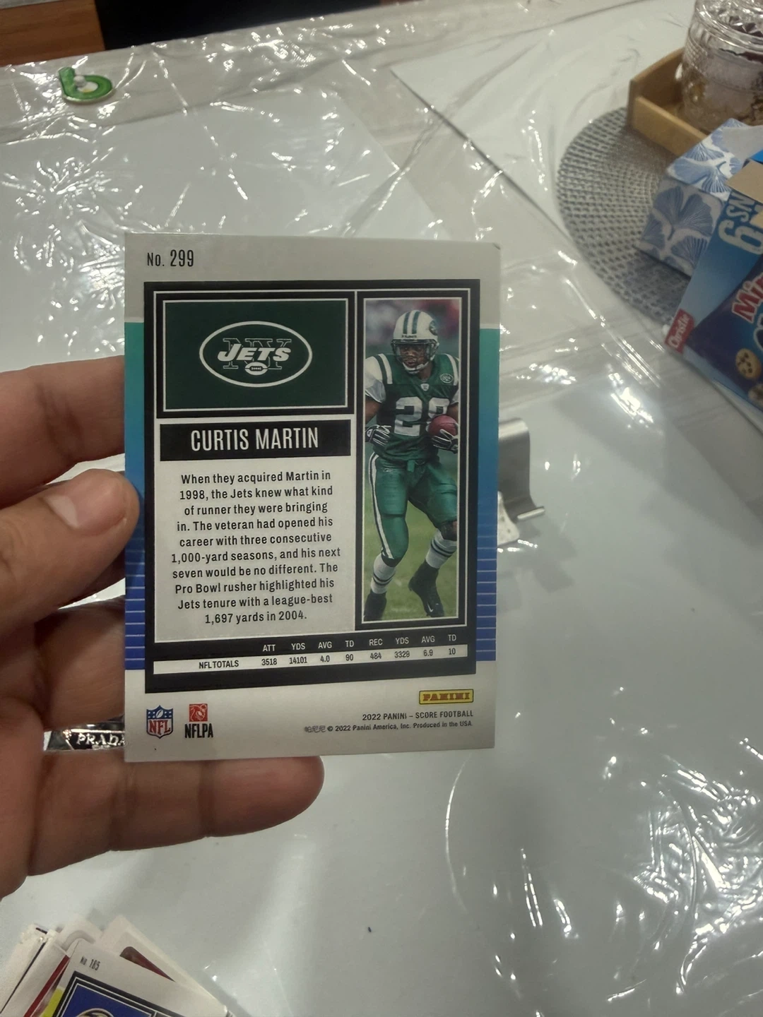 This is a 2022 Panini Score football card featuring Curtis Martin. It's number 299 and includes career stats on the back. The card is in good condition.