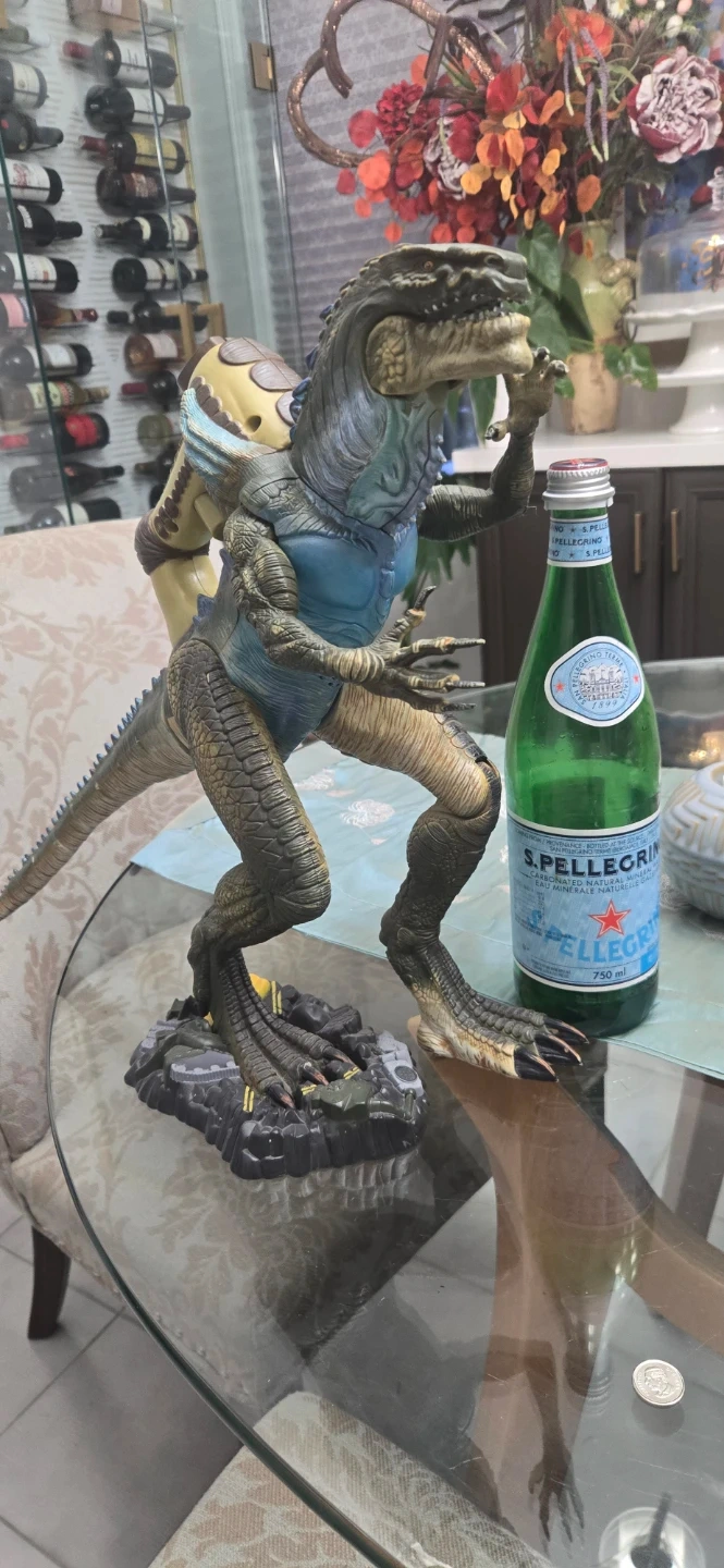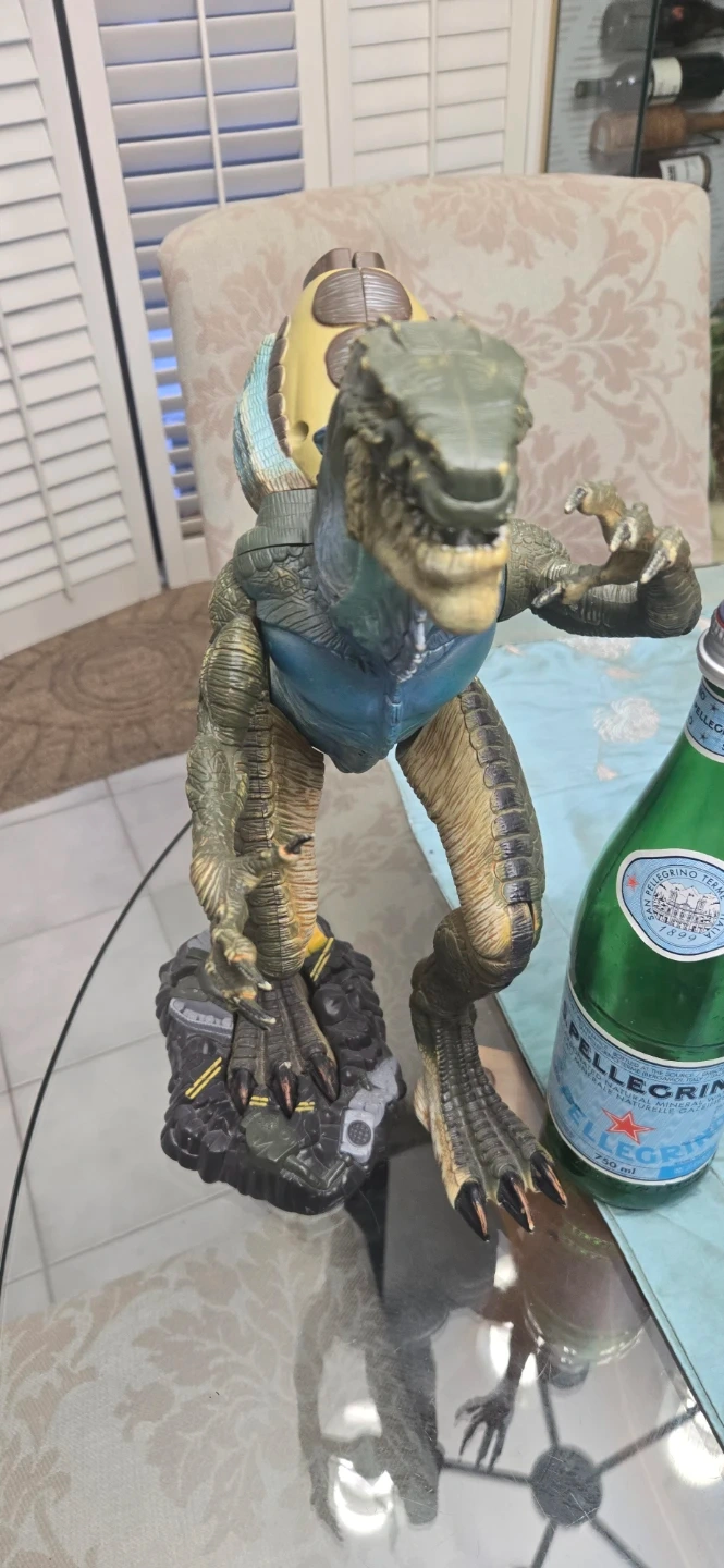 This is a detailed dinosaur action figure with a display base. It has a unique sculpt and textured finish. The figure's limbs appear to be articulated for posing.