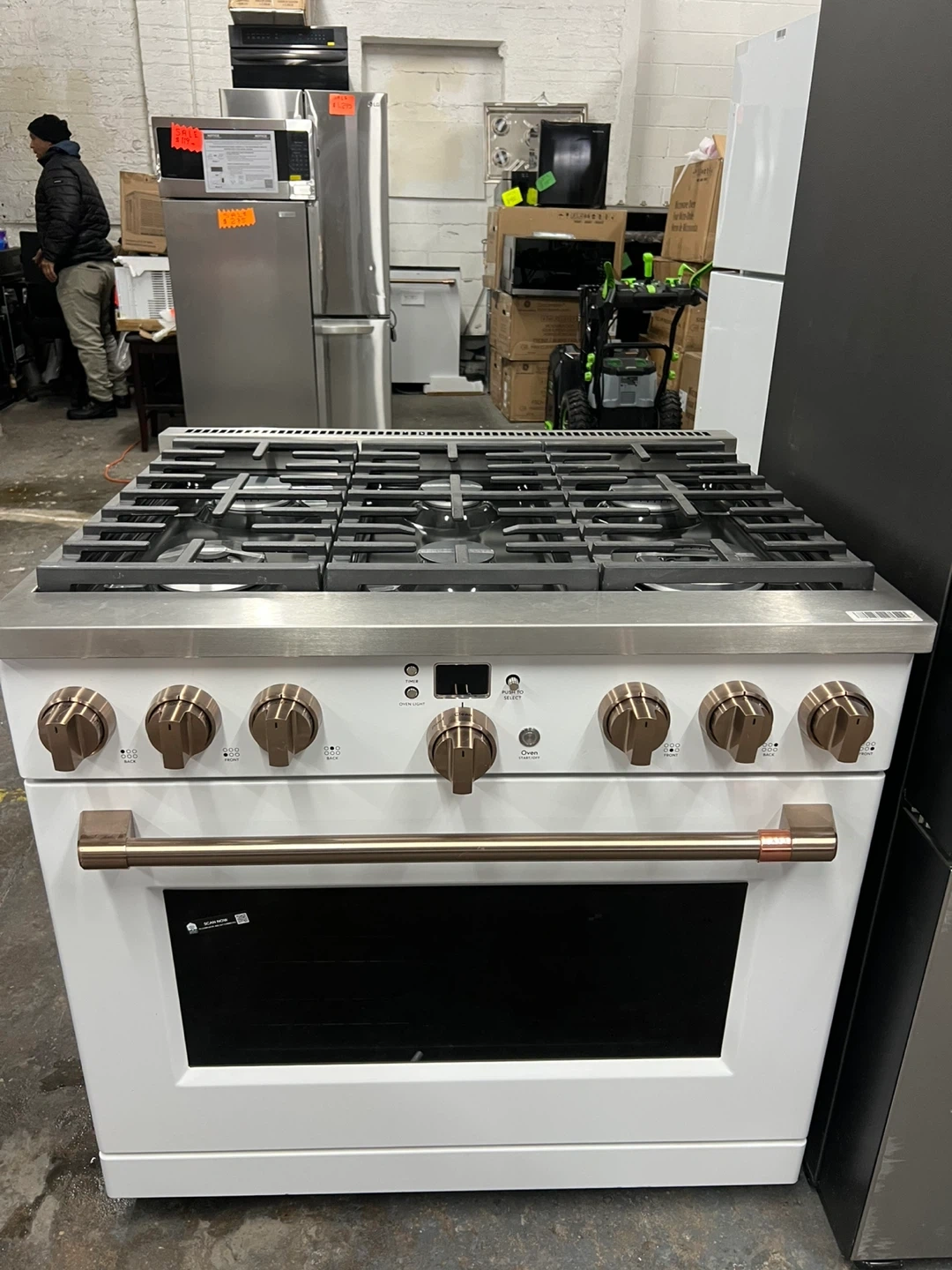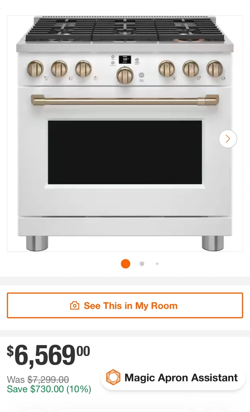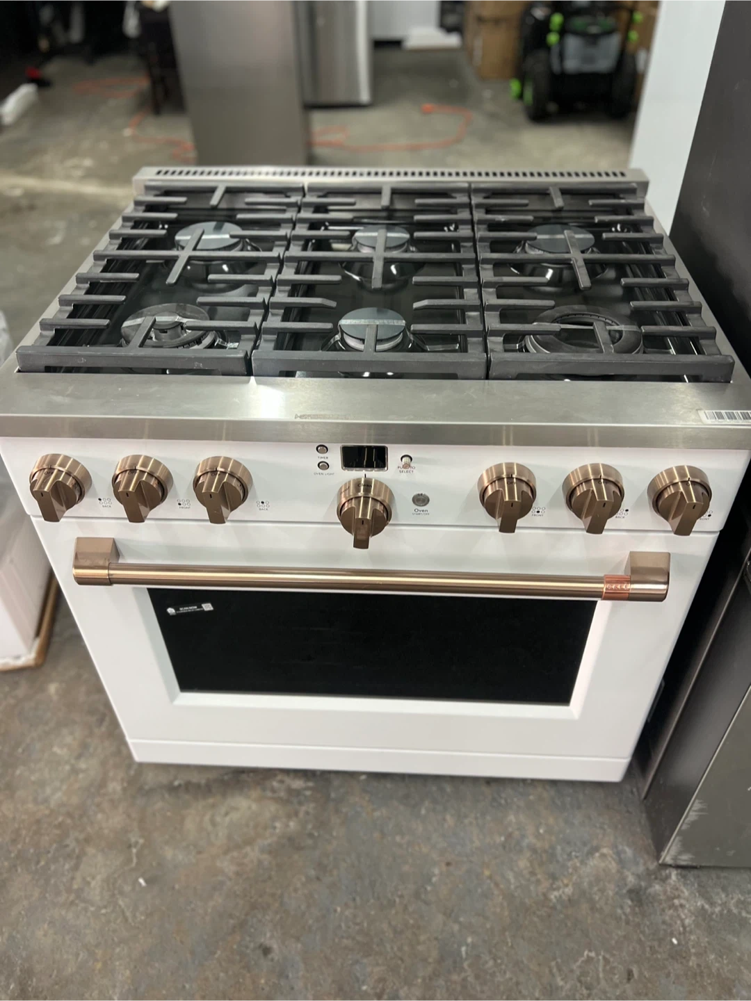 This Cafe 30" gas range features a striking matte white finish with brushed bronze hardware. It includes a spacious oven and a five-burner cooktop. Perfect for upgrading your kitchen's style and functionality!