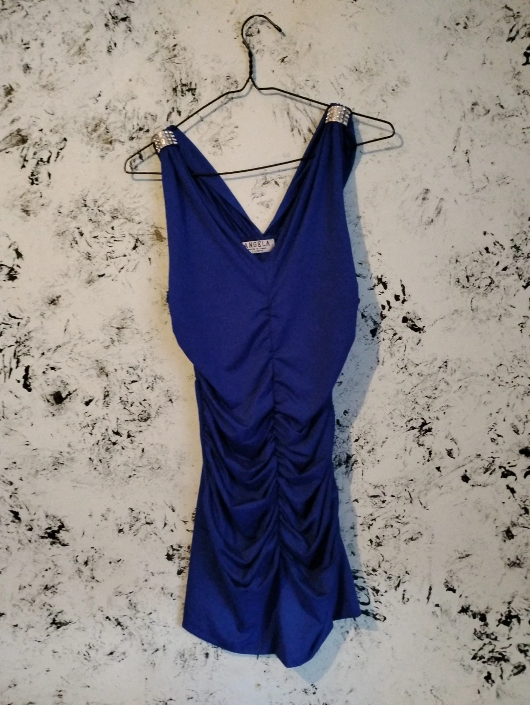 Here's a lovely blue dress from Angela! It features a V-neck and ruched detailing. Perfect for a night out or a special occasion