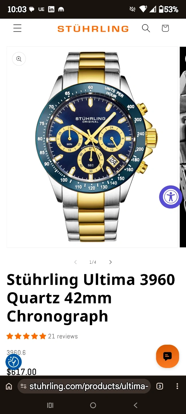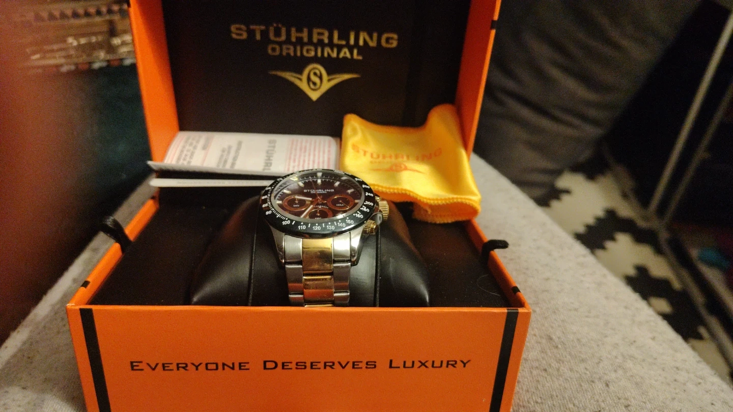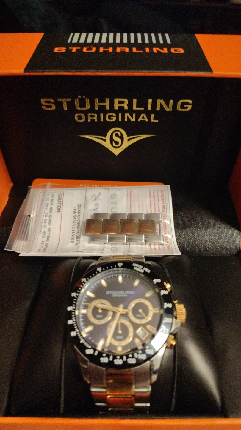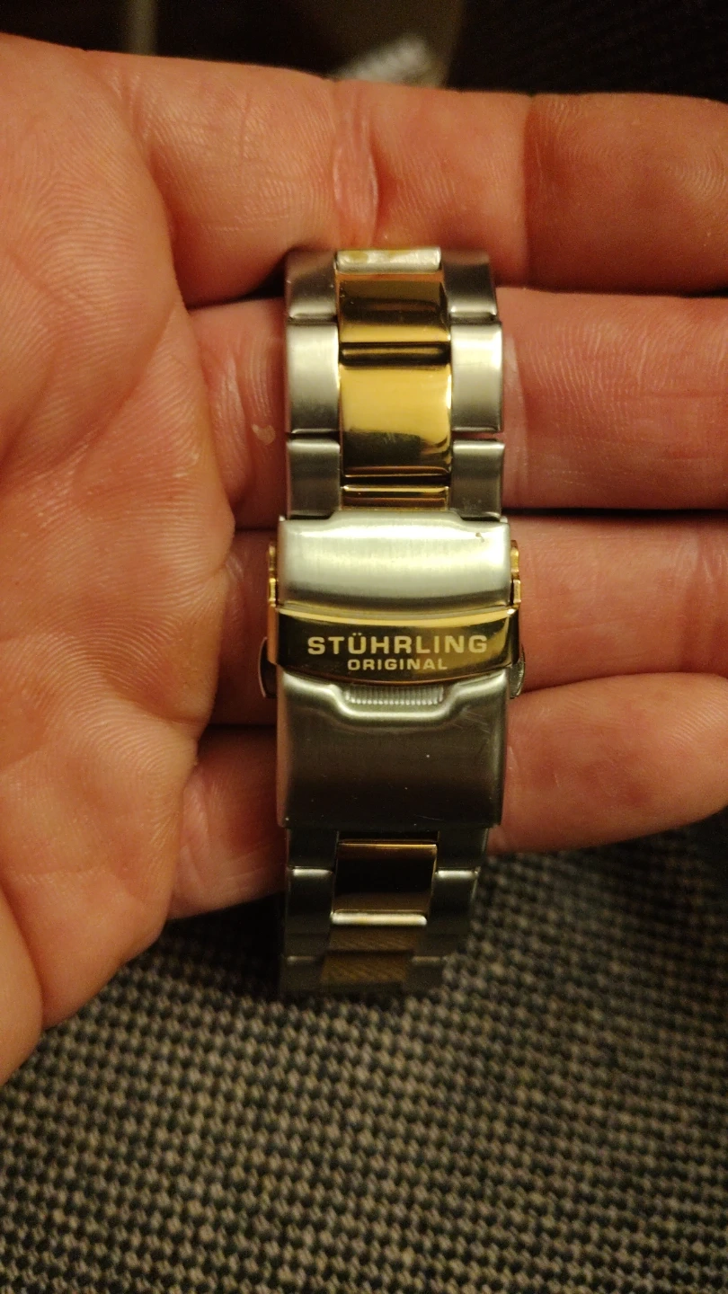 This Stuhrling Original watch features a stainless steel and gold-tone band with a Japanese movement. It includes the original box and extra links. It's a nice timepiece with a sophisticated look.