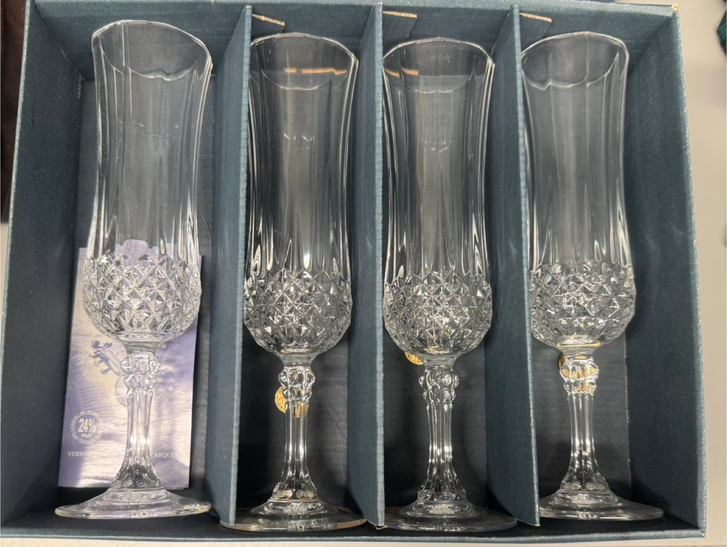 Selling a vintage set of 4 Cristal d'Arques Longchamp champagne flutes. They are in excellent condition and come in their original box! These elegant flutes are perfect for any celebration or special occasion. The box indicates they are made of genuine lead crystal.