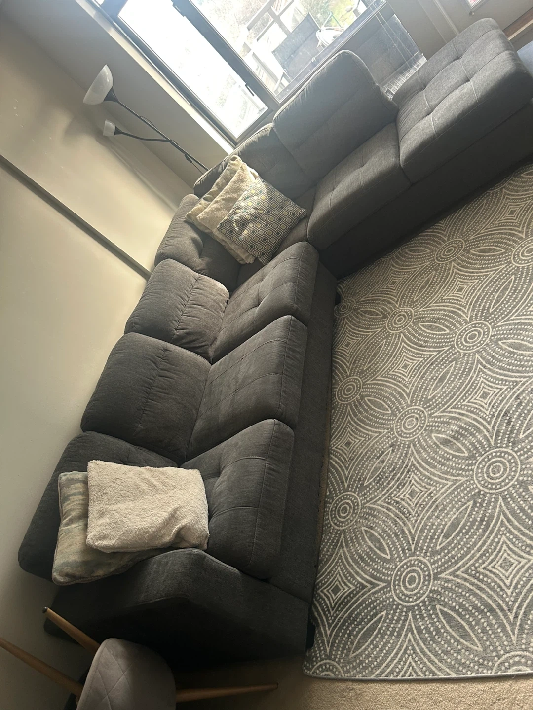 This is a comfortable grey sectional sofa. It's upholstered in a durable fabric with tufted seat cushions. The modular design offers flexible seating arrangements. It's a great piece for any living room!