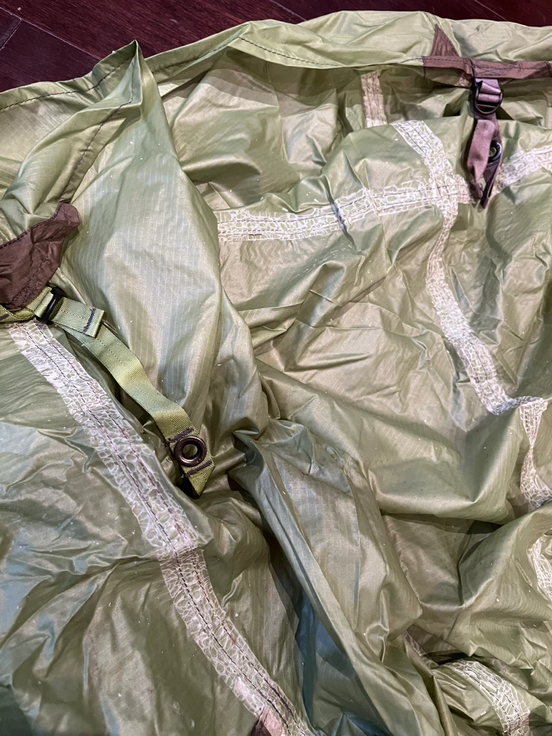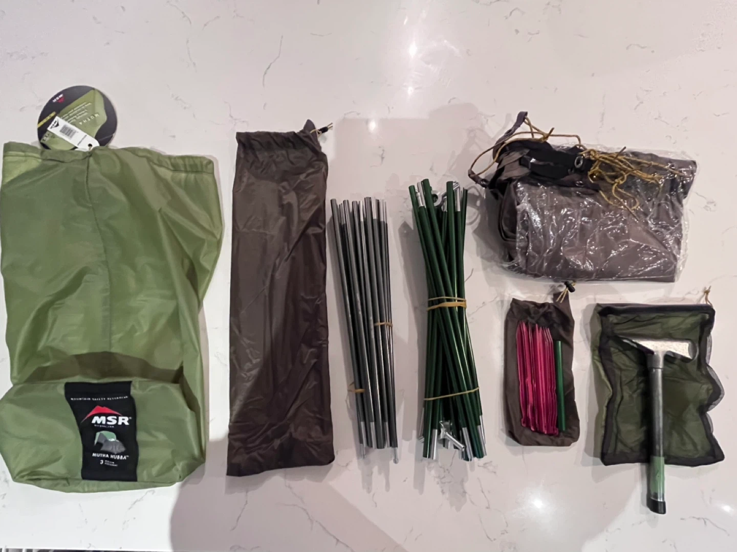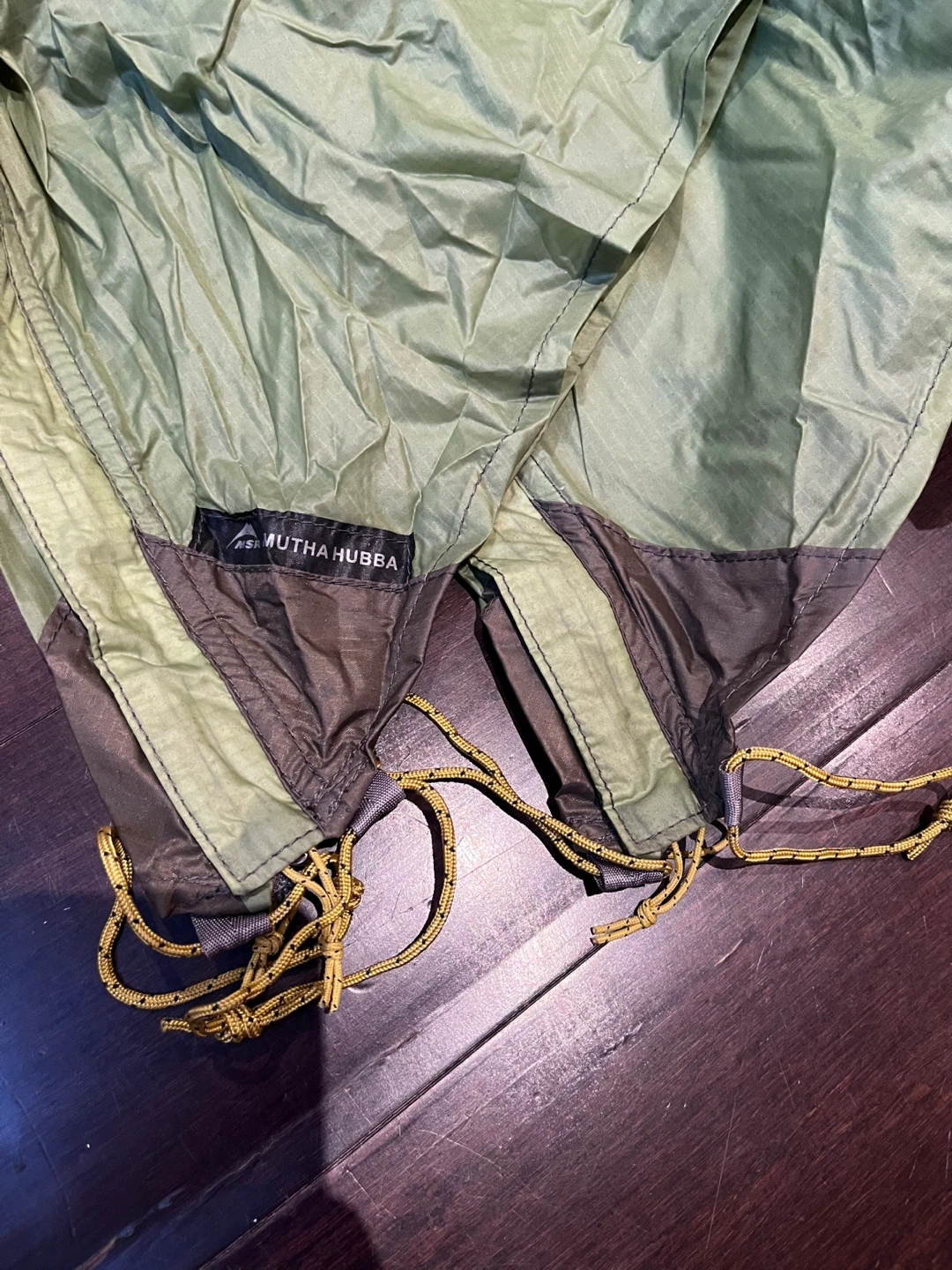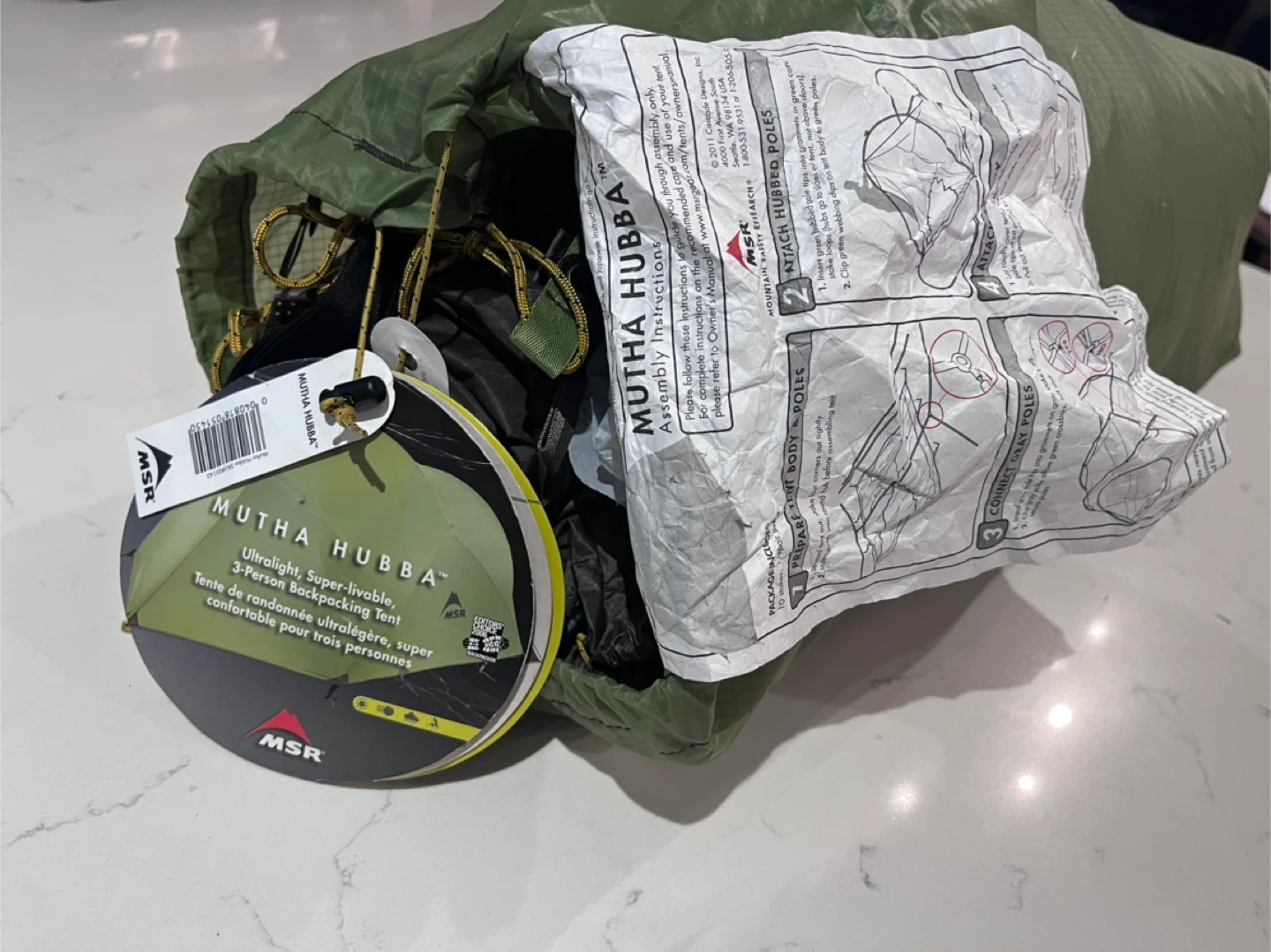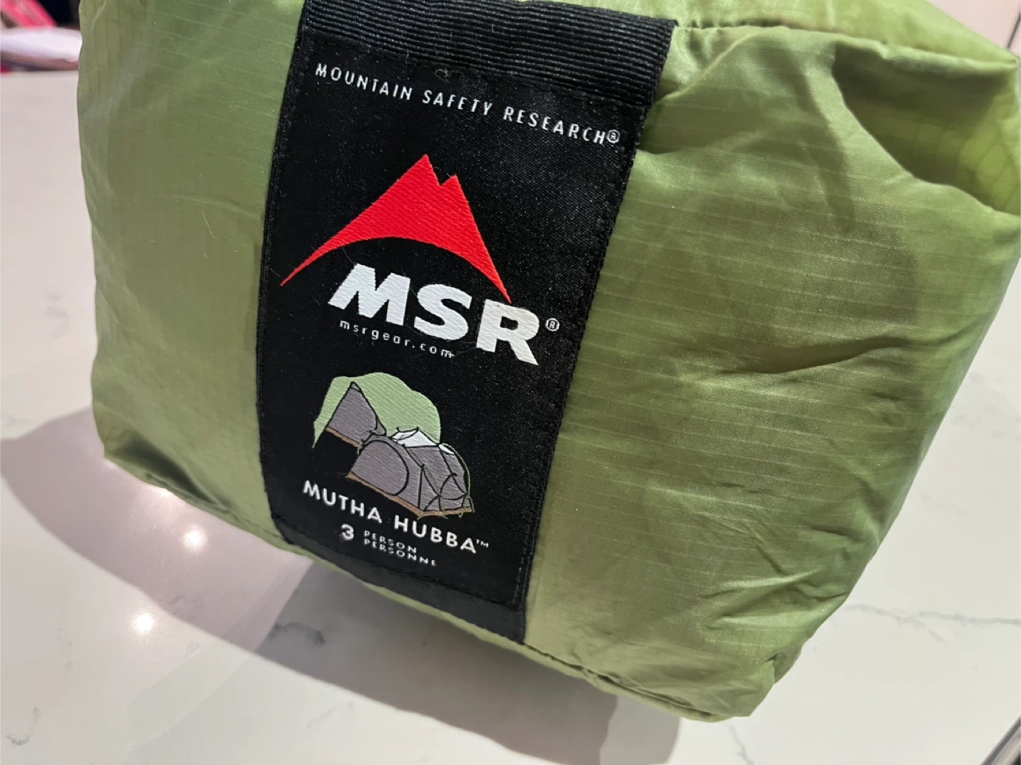 MSR Mutha Hubba three-person, two-door, dual-vestibule, three-season tent. Experience Series. Comfortably fits two people. Gently used on one previous camping trip. No rips or tears, zippers working, footprint and stakes included. Admittedly, the inner seals on the stitching for the outer shell is somewhat deteriorated but I believe they can be resealed if desired (see last photos). Could use some time to off-gas before use, as it has been packed away for a while.
