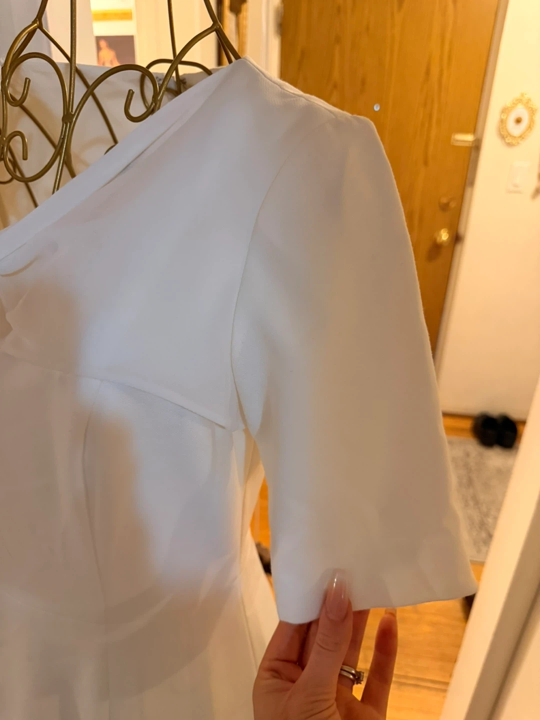 Never worn. Elegant white BCBGMAXAZRIA dress with a stylish twist front detail. Short sleeves and a flattering silhouette. Size 04.